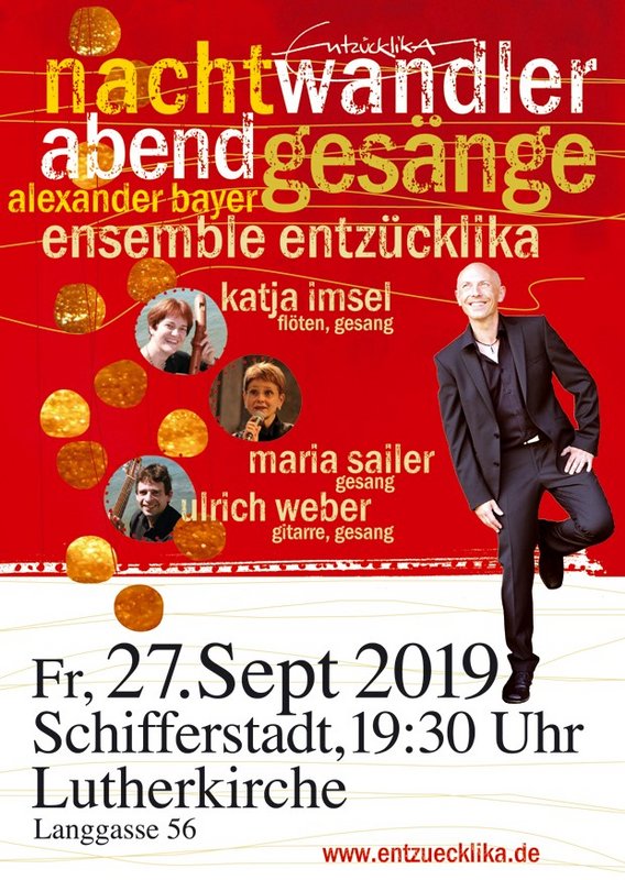 Der in der Schweiz wirkende Priester und Liederschaffende Alexander Bayer macht mit seinen originellen Musik-Projekten auf sich aufmerksam; es ist der originelle Stilmix der Lieder, der einzigartige Klang und das Agieren der Musiker, das immer wieder über das Konzertieren hinausgeht. Sein Ensemble Entzücklika versteht es, eine feierliche Atmosphäre zu erzeugen, Ernstes und Heiteres in der Balance zu halten und mit einer guten Textauswahl spannungsvoll zu bleiben. Das Ensemble hat es zu einer bestaunten Kunstfertigkeit gebracht, mit Liedern ein Wechselspiel von Stimmungen zu erzeugen, das im Verlauf des Konzertes immer mehr als eine eigene Art von Liturgie empfunden wird.