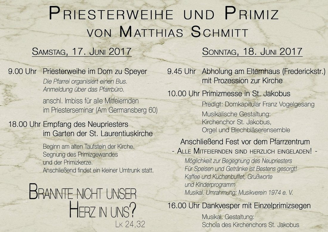 Die Priesterweihe und Primiz von Matthias Schmitt fand bereits im vergangenen Jahr, 17./18.06.2017 in Speyer bzw. Schifferstadt statt.
