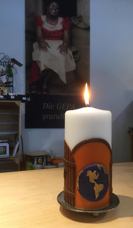 Pastoralreferent Heinrich Schmith überbrachte ebenfalls Glück- und Segenswünsche der Pfarrei Heilige Edith Stein. Er übergab dem Team eine Kerze mit einem ganz besonderen Symbol. Denn sie zeigt eine Weltkugel, die durch eine geöffnete Tür sichtbar wird. So wird der Weltladen dadurch, indem man durch die Tür hindurch geht, zu einem Ort, in der man der Welt begegnet, mit Gerechtigkeit, Solidarität und Ökologie. "Deshalb war es uns ein Anliegen, hier ein Licht zu entzünden, um die Belange unserer Welt wichtig erscheinen zu lassen", merkte er an.