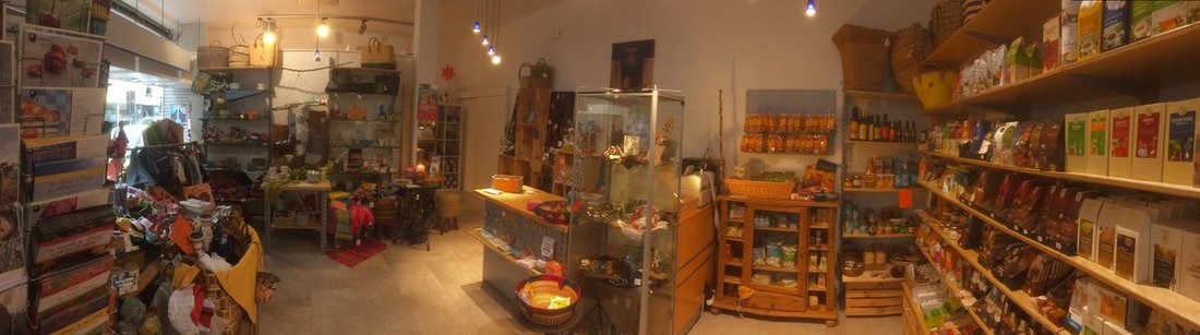 Große Auswahl an Kaffee, Tee, Schokolade, Marmelade, Reis, Nüsse und Gewürze handgefertigte Kerzen, Leder- und Keramikwaren, Textilien, Schmuck, Säfte und Weine aus dem Bio-Weinanbau der Lebenshilfe Bad Dürkheim und Speyer-Schifferstadt, Artikel aus Burkina Faso, "Klick-Boxen" in Serviettentechnik (PET Recyclingboxen aus Südafrika).