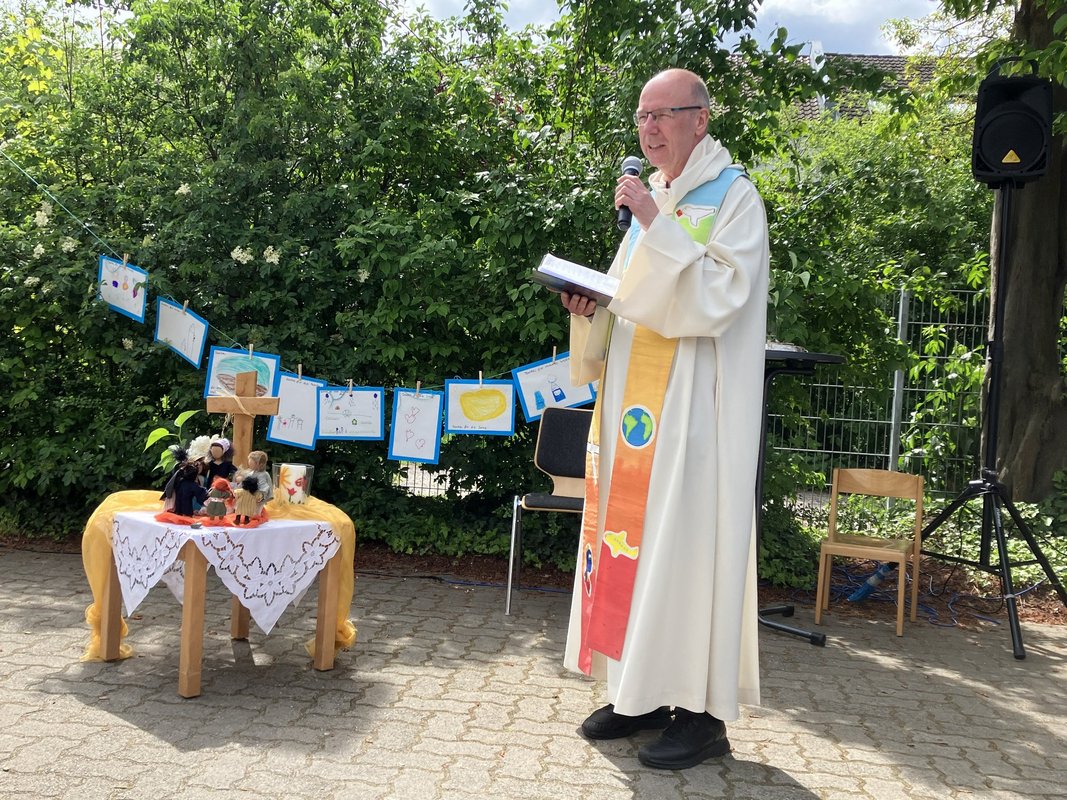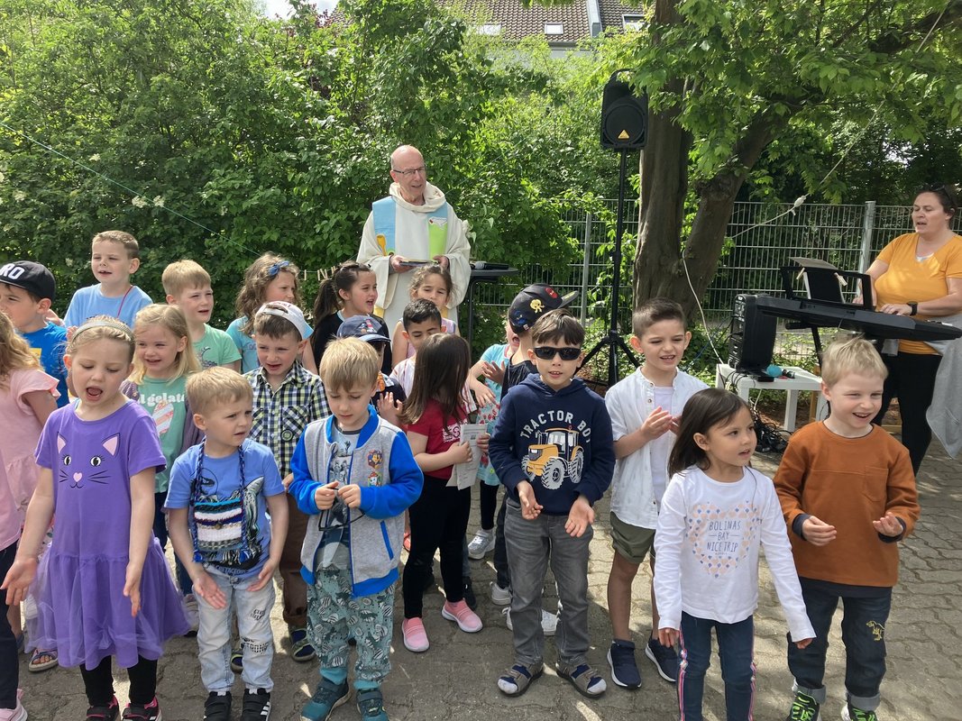 "Wir feiern heut ein Fest", erklang es aus den Kehlen der Kita-Kinder von St. Jakobus und deren zahlreichen Gäste am Samstagvormittag, 6. Mai, zu Beginn ihres "Spiel- und Spaßfestes" auf dem Gelände ihrer Einrichtung in der Bleichstraße. Viele Eltern, Großeltern und weitere Gäste ließen es sich nicht nehmen, mitzufeiern, denn schließlich war es das erste große Fest dieser Art nach der Corona-Pandemie, das mit herrlichem Frühsommerwetter belohnt und einem Wortgottesdienst eröffnet wurde. "Nach dem Winter freuen wir uns sehr, dass wir bei diesem schönen Wetter wieder im Freien feiern können", sagte dann auch Pfarrer Stefan Mühl zu Beginn.