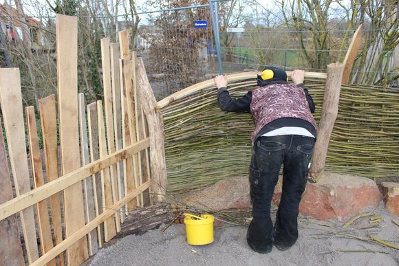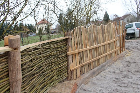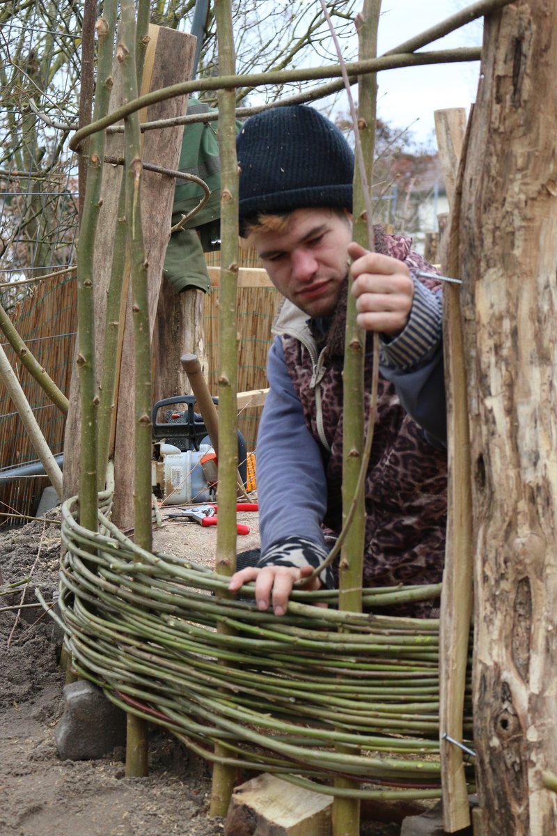 ... aus Weiden- und Haselruten entstehen 2 Zaunelemente. Weitere Elemente fertigten wir aus Robinienhözer an