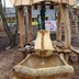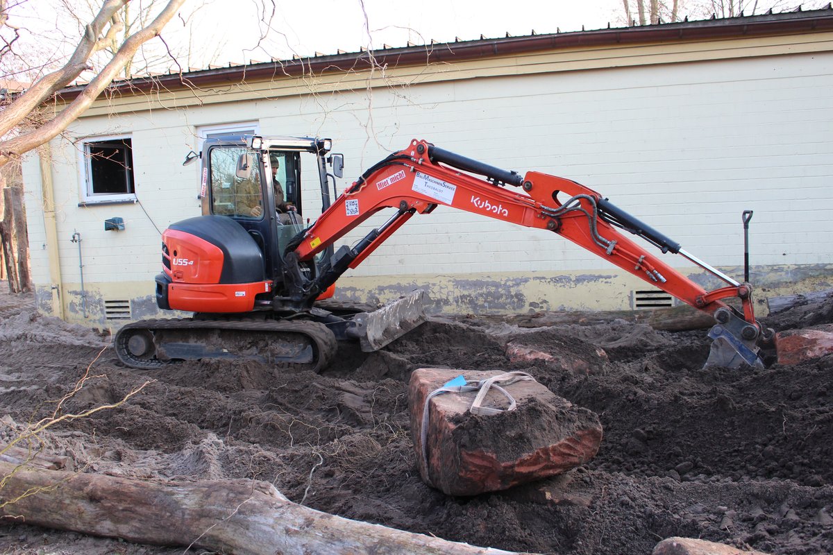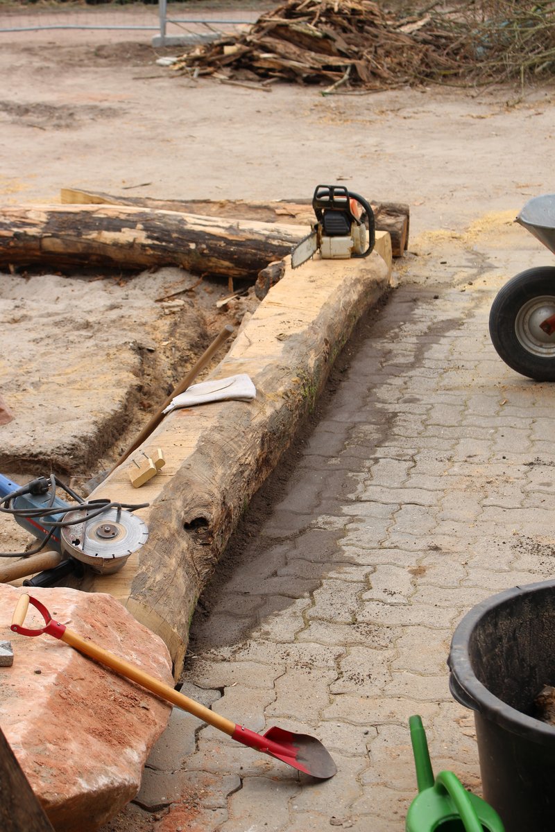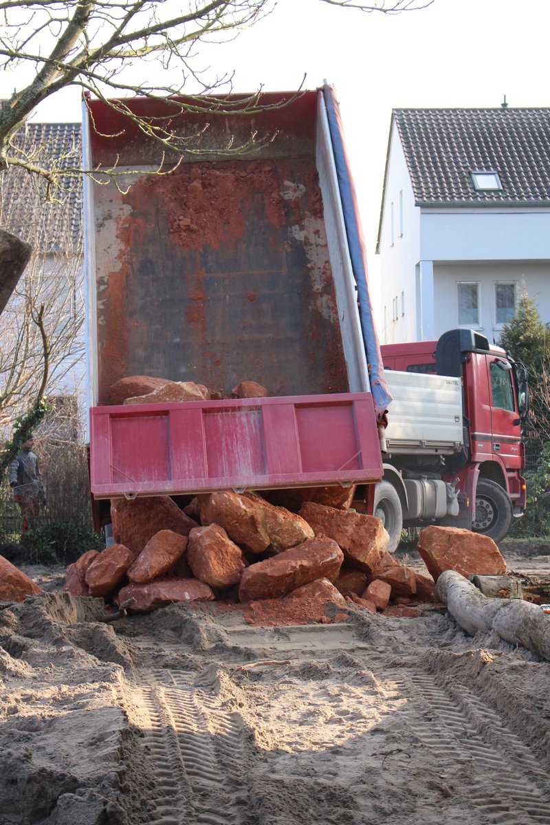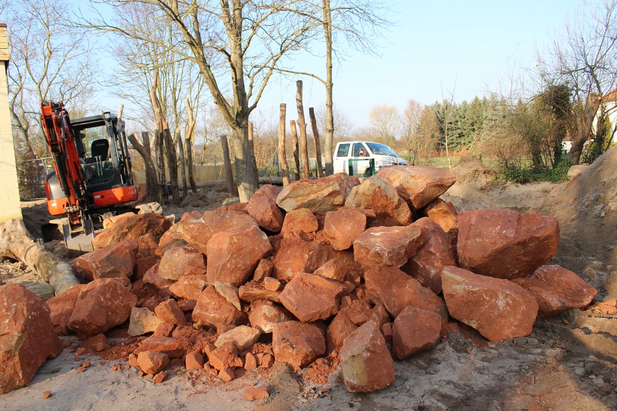 Mit dem Bagger wurden die Steine an Ort und Stelle gehievt und in Position für den Wasserlauf gebracht. Die stehenden Podesthölzer haben wir abgeschliffen und das Gelände eingeebnet.