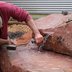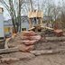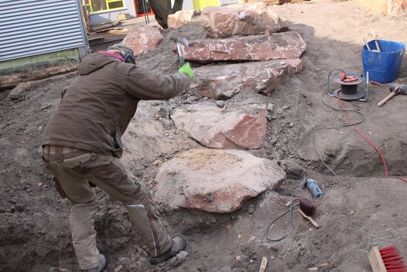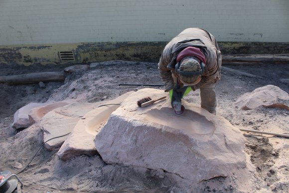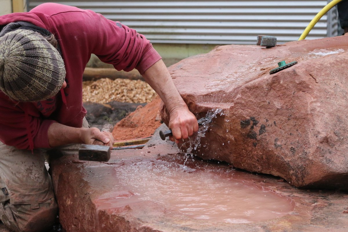 Mit viel Feingefühl, Hammer und Meißel wurden die einzelnen Steine des Wasserlaufs bearbeitet. Es entstehen schöne Sandsteinbecken zum Planschen und Matschen.