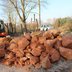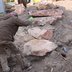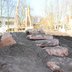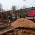 Der Hügel für die Wasserburg wird mit dem Bagger vorbereitet. Liegende Hölzer werden in die richtige Position gezogen. 15 Tonnen Sandsteine werden geliefert.