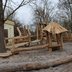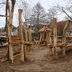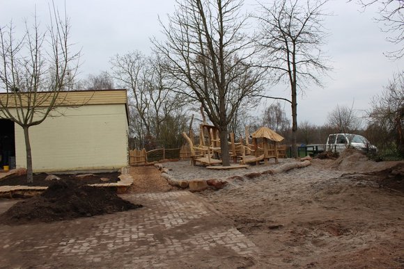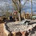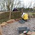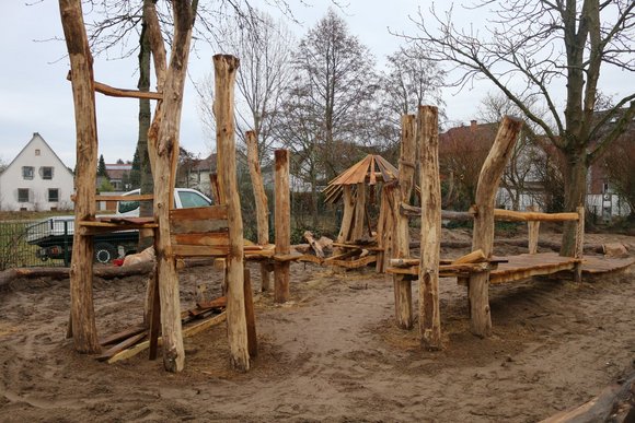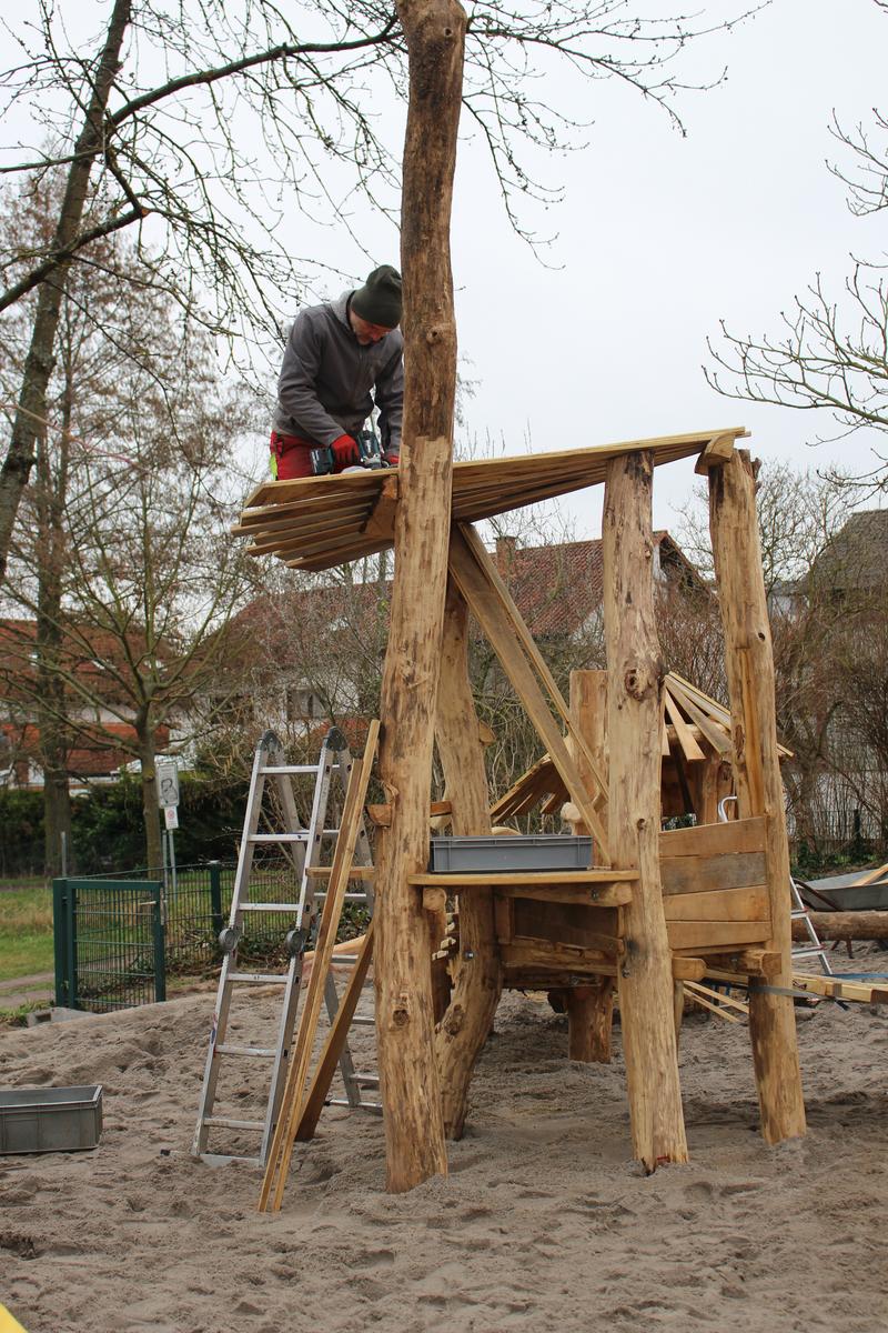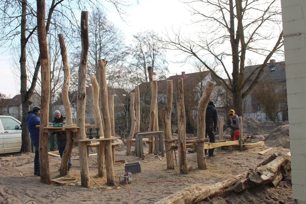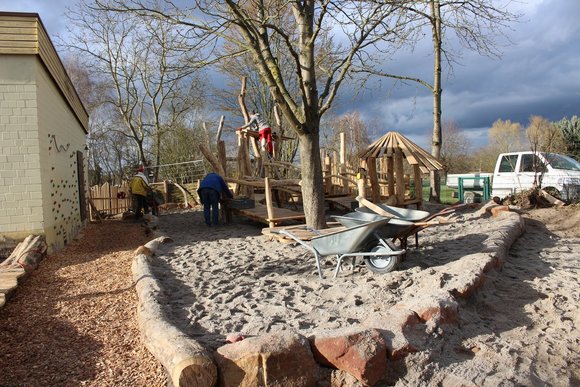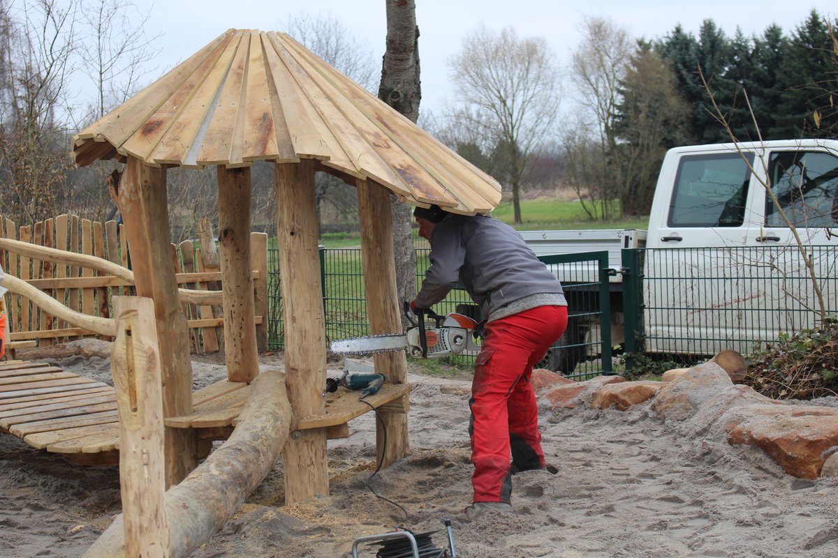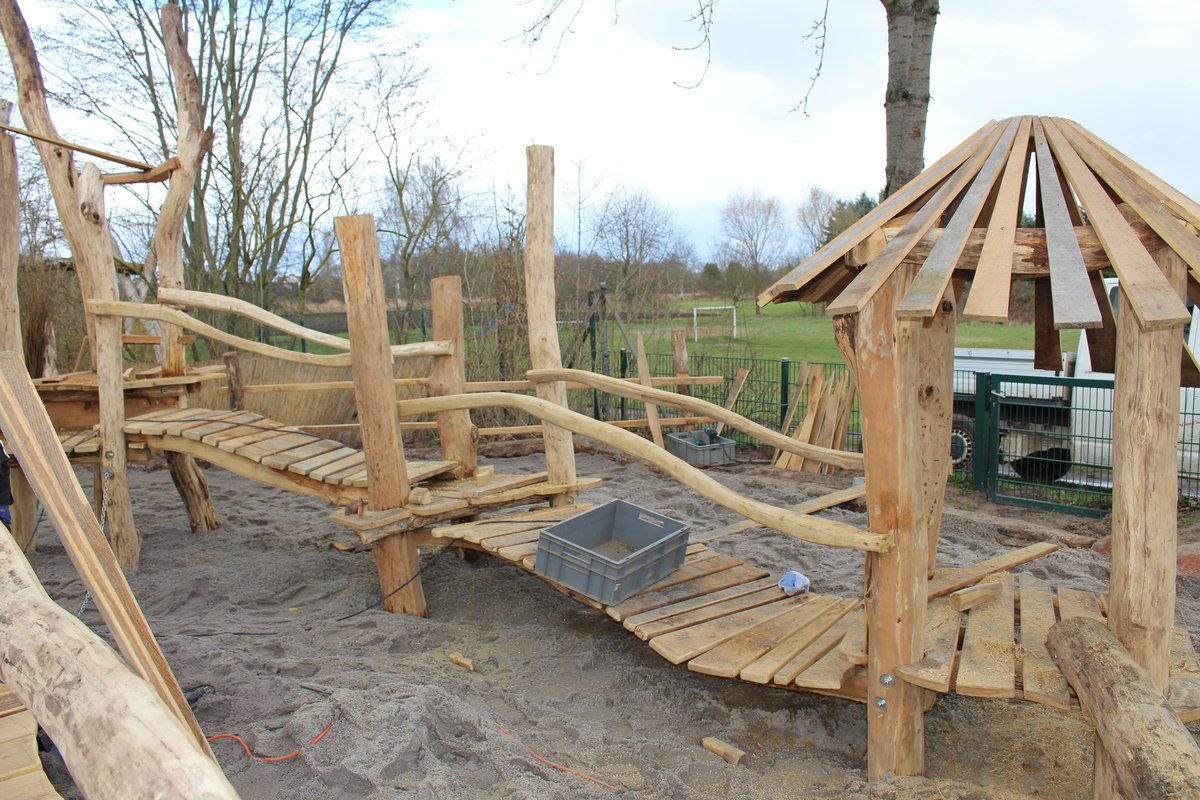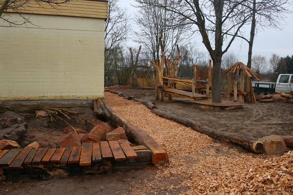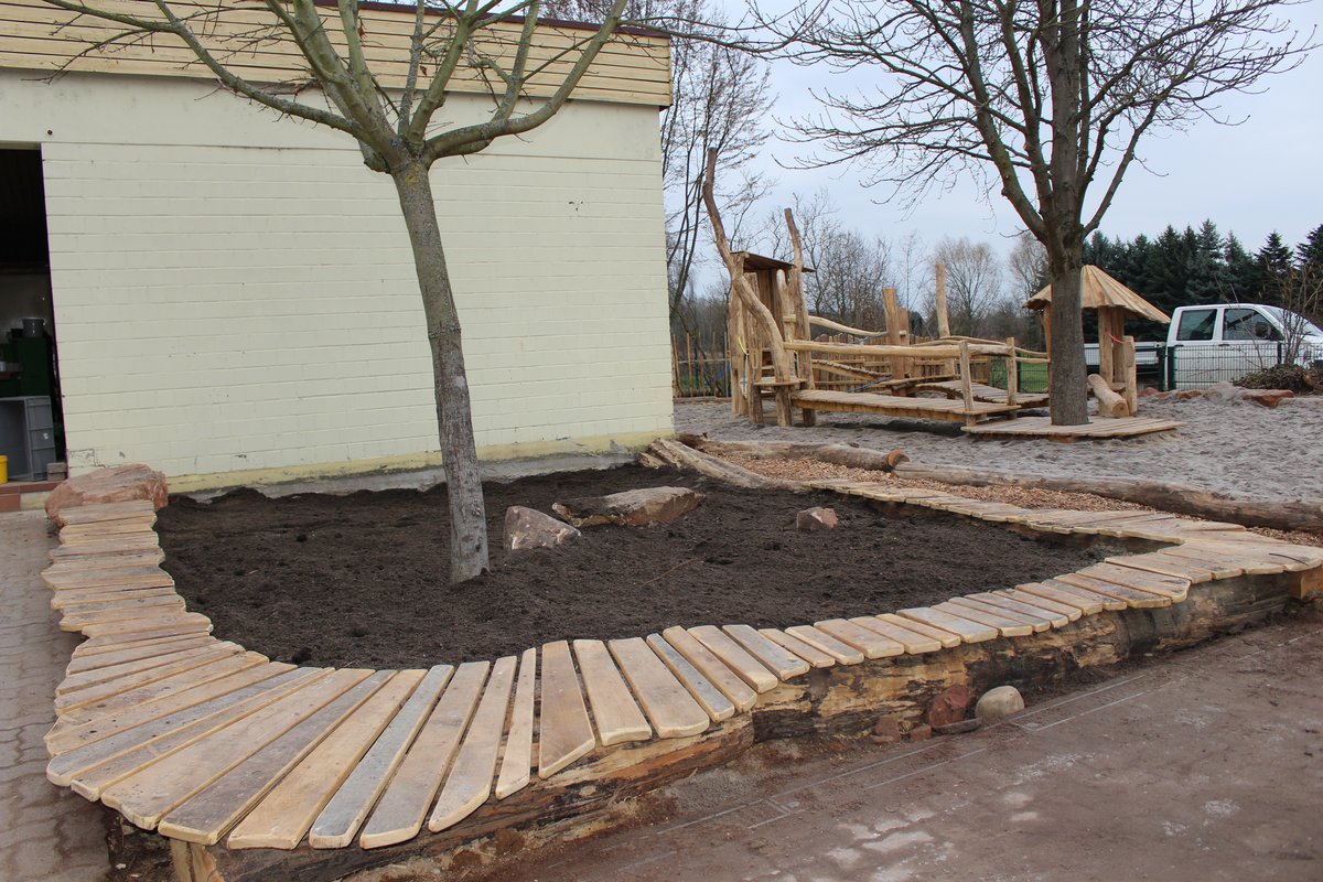 Wasserrinnen und ein Matschtisch aus Robinienholz wurden gefertigt und an Ort und Stelle platziert. Die Pflanzflächen auf dem Hügel wurden vorbereitet. Eine Holzbrücke überragt nun den Sand- und Matschbereich.