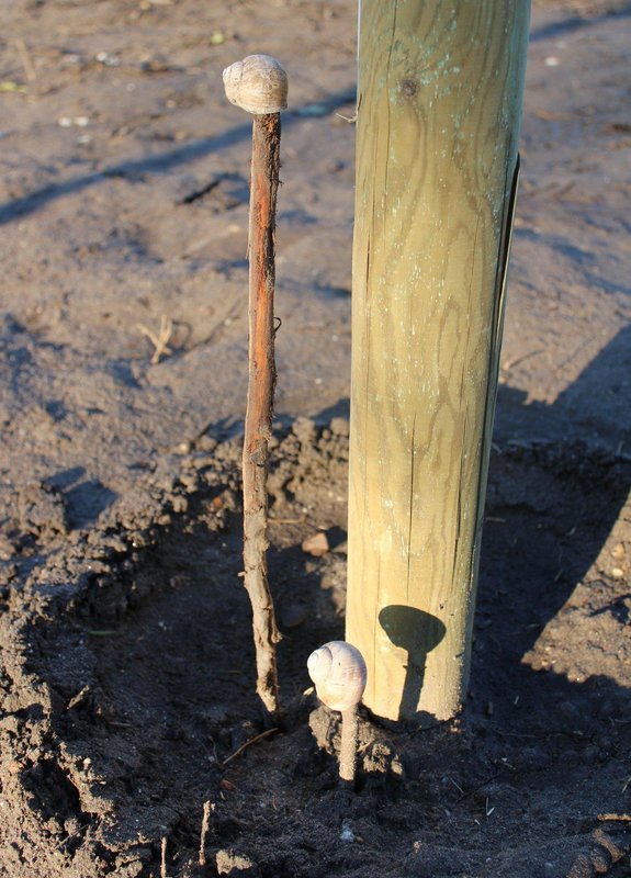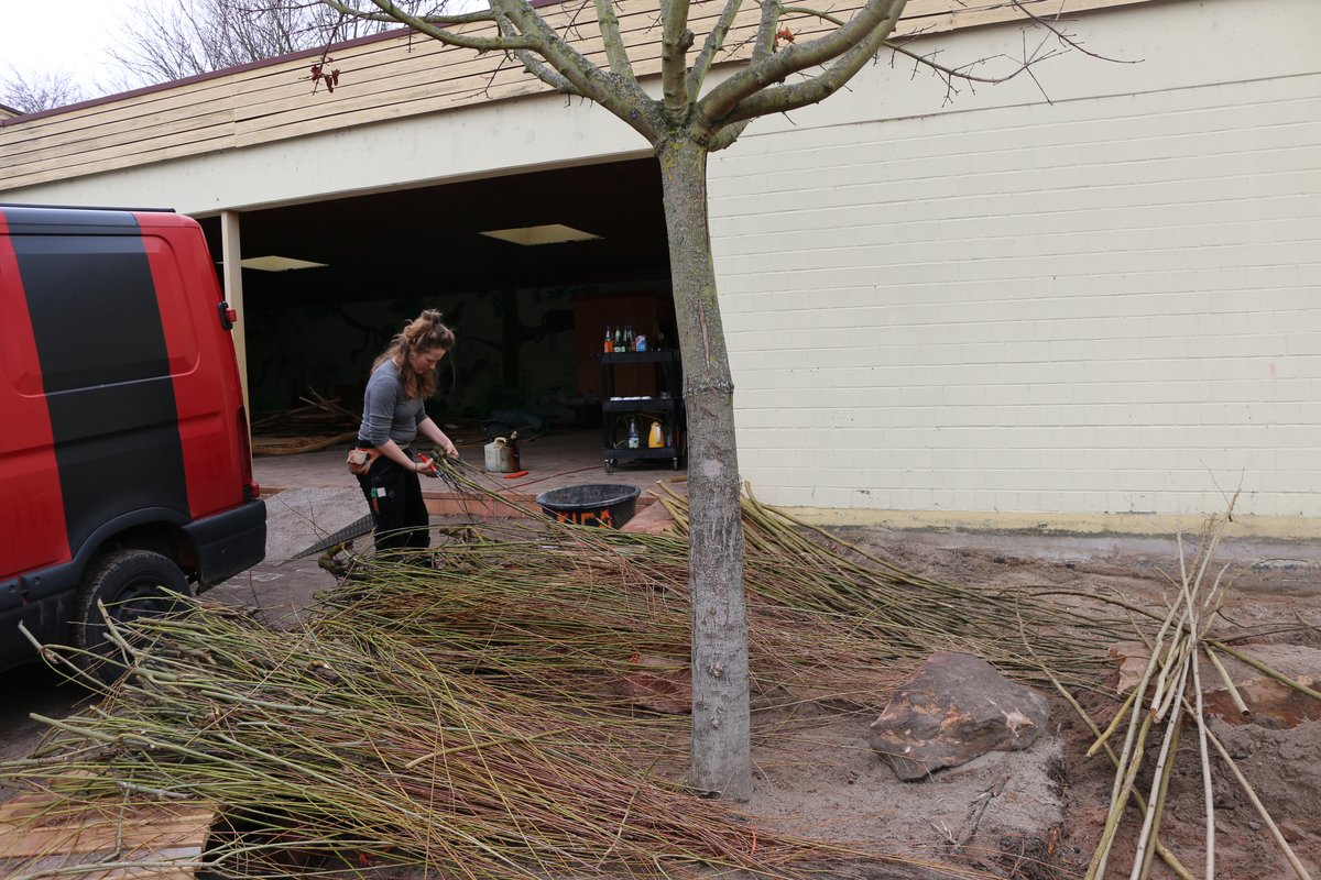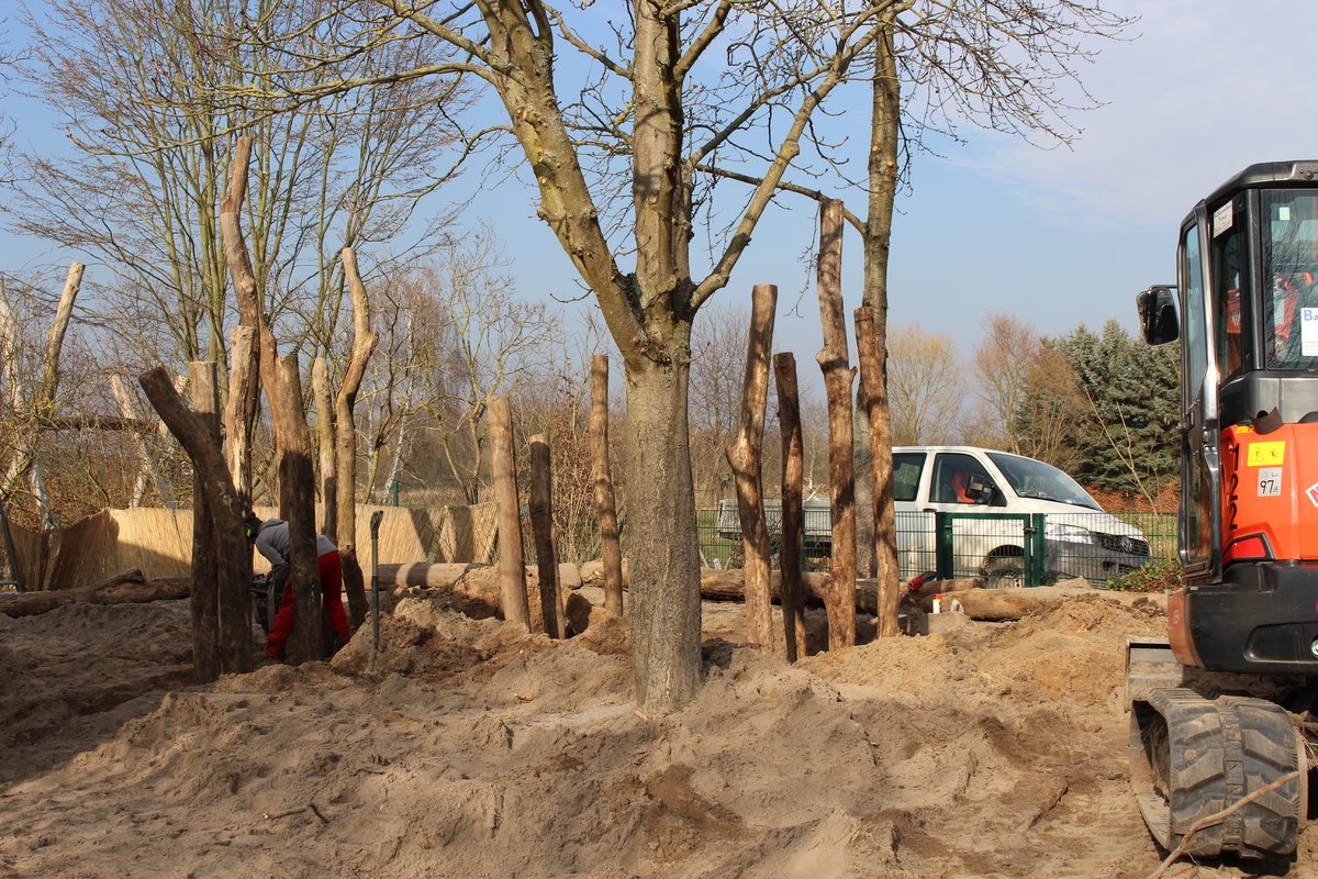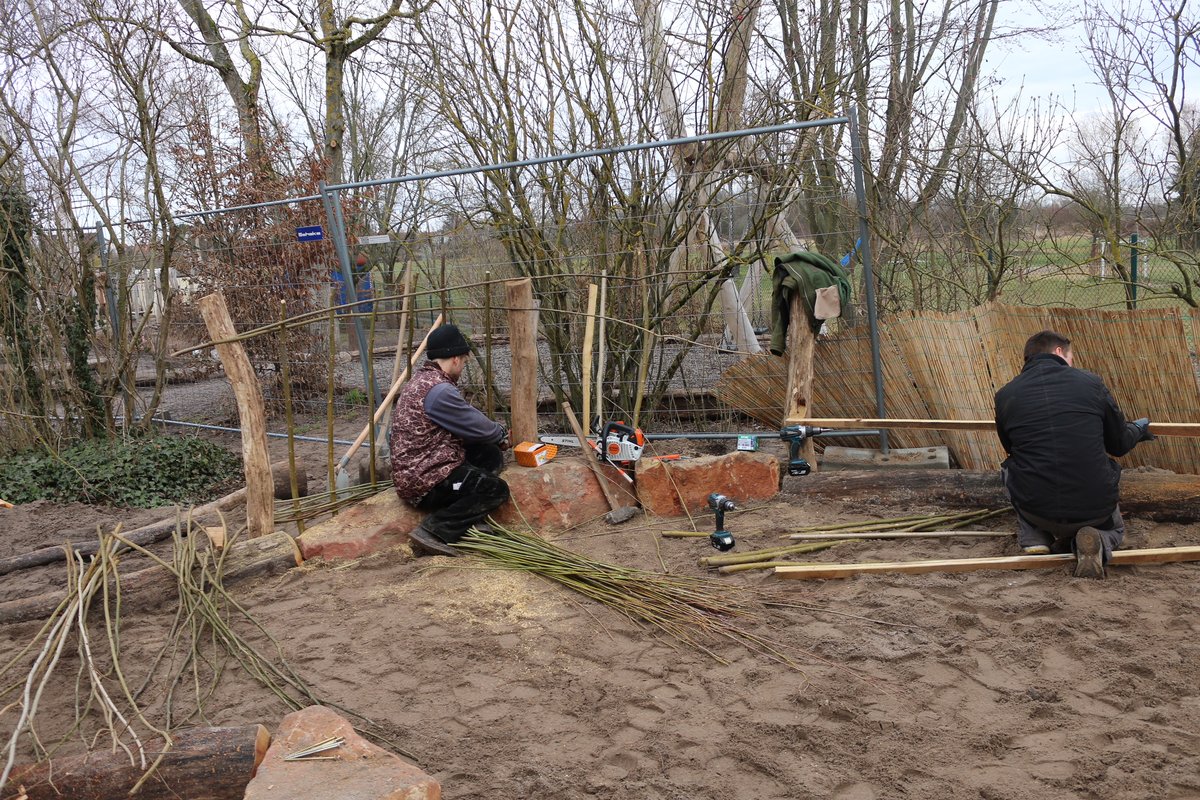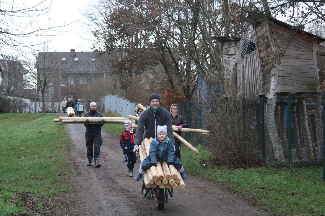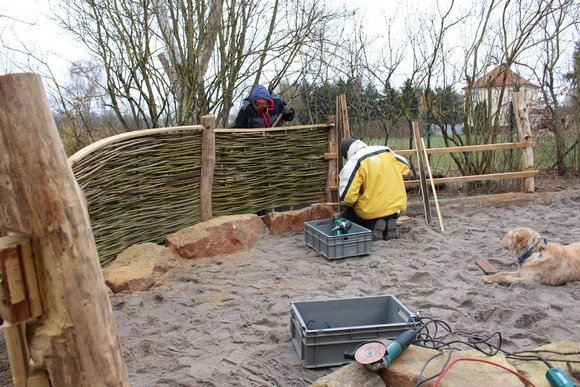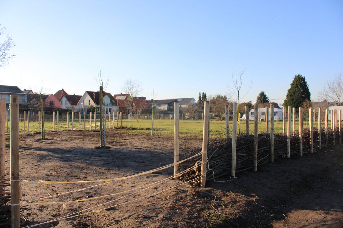 Für die Eltern und sonstigen Helfer hieß es dagegen zunächst die Materialien und das Pflanzgut vom Lagerplatz an den Kita-Gebäuden zur Projektfläche zu tragen, um dann sogleich damit zu beginnen, Löcher für die Bäume auszuheben als auch die Stützpfähle für die Bäume und die Hecke in den Boden zu schlagen. Anschließend waren die Obstbäume zu pflanzen, anzubinden, mit einem Verbissschutz zu versehen und zu wässern. Die Hauptaufgabe beim Anlegen der Totholzhecke lag neben dem Setzen der Stützpfeiler, vor allem darin, entsprechendes Schnittgut in Form zu bringen und zwischen den Stützpfeilern zu positionieren.
