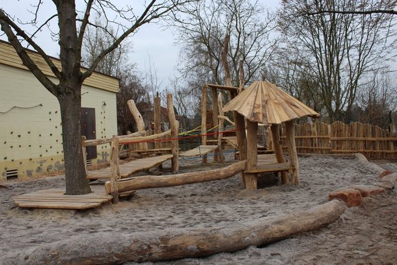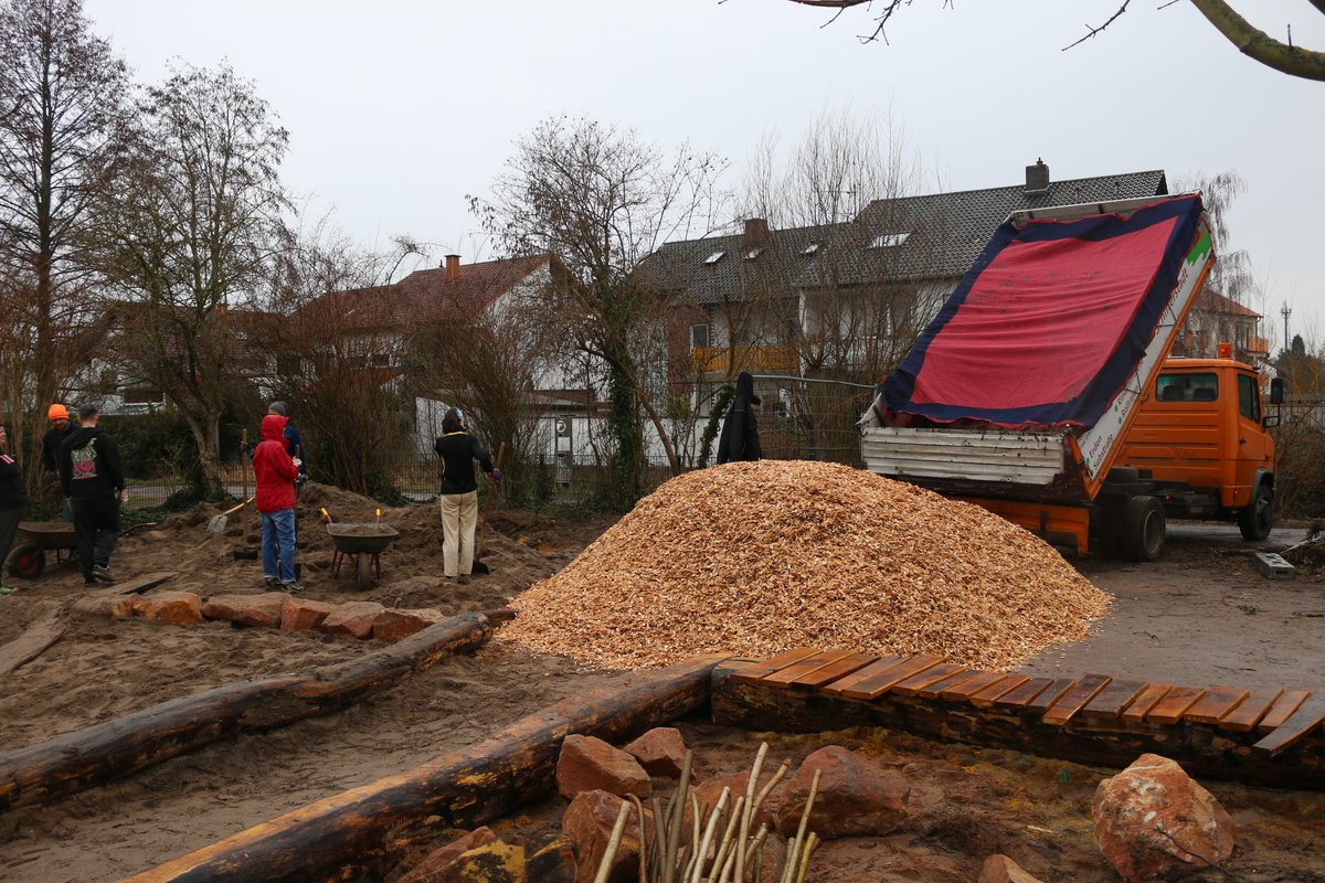 Eine kleine Hängebrücke ist entstanden, Seile zum Balancieren und Festhalten wurden angebracht. Wir haben massenhaft Sand gefahren und als Fallschutz ausgebracht.