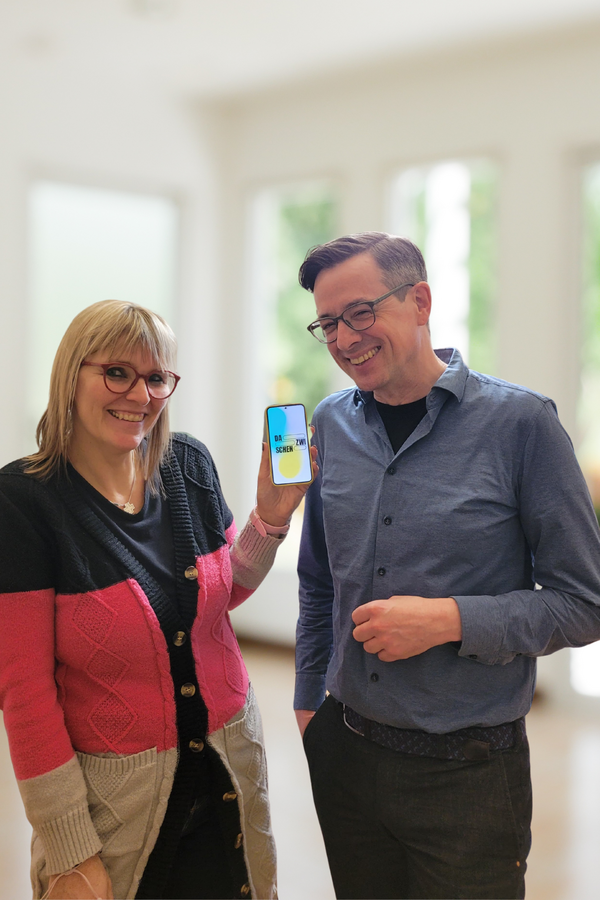 Tanja Rieger, Referentin für Glaubenskommunikation, und Felix Goldinger, Leiter der Stabsstelle Innovation und Transformation, aus dem Bistum Speyer präsentieren die DA-ZWISCHEN App © DA-ZWISCHEN Community, Bistum Speyer