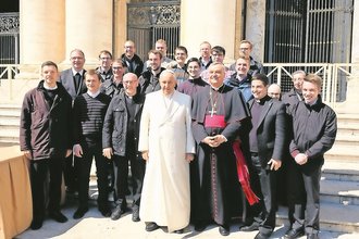 Begegnung in Rom: Speyerer Priesteramtskandidaten trafen 2015 zusammen mit Bischof Wiesemann (vorne, 5. v. l.) und Generalvikar (damaliger Regens) Markus Magin (vorne, 3. v. l.) Papst Franziskus (vorne, 4. v. l.) © Privat/L'Osservatore Romano