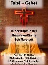 Auch im Dezember wird es wieder ein Taizé-Gebet in der Kapelle der Kirche Herz Jesu (Salierstr. 104) geben. Es findet am Sonntag, 14.12. (3. Advent) um 19:00 Uhr, statt und wird als "Abend der Lichter“ gefeiert". Wie an jedem Samstag in Taizé üblich, erhalten die Mitfeiernden eine Kerze und das Licht wird von Person zu Person weitergegeben. Das Licht wird ausgehen vom "Friedenslicht aus Betlehem", das nach seiner langen Reise an diesem Tag von der Aussendungsfeier in der Gedächtniskirche in Speyer (15:00 Uhr) nach Schifferstadt gebracht wird.