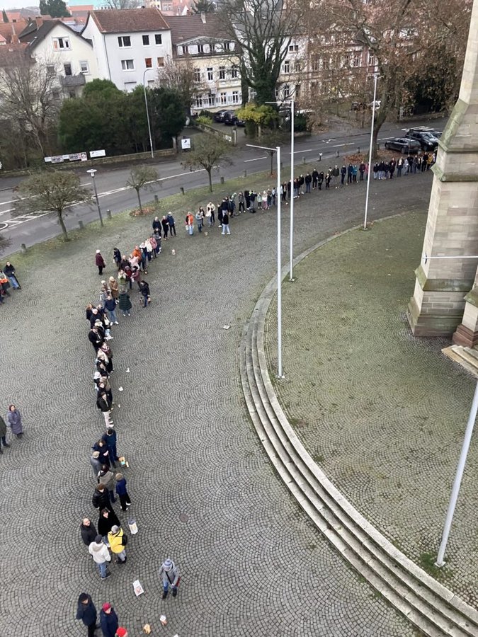 Unter dem Motto "Ein Funke Mut" bot die bunt gefüllte Kirche den Rahmen für Gebete, Musik und Gedanken, die Mut machten und Hoffnung spendeten – gerade in einer Zeit, in der Konflikte und Unsicherheiten viele Menschen bewegen. Das Friedenslicht erinnert daran, dass Frieden im Kleinen beginnt: bei jedem einzelnen Menschen und in jeder Gemeinschaft. Durch eine Menschenkette um die Gedächtniskirche herum wurde dies besonders deutlich gemacht. "Wir möchten mit dieser Geste zeigen, dass Frieden Zusammenhalt braucht und diese Botschaft nach außen tragen", erklärt Simone Eisenlohr, Mitglied der Aktionsgruppe. "Beim Friedenslicht entsteht ein ganz besonderes Gemeinschaftsgefühl und es wird spürbar, wie viele Menschen sich für ein friedliches Miteinander stark machen wollen." Mit der Unterstützung der Feuerwehr Speyer konnte dieses Ereignis aus der Höhe fotografiert und festgehalten werden.