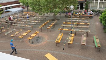 Auf dem Pfarrheimhof laden viele Helfer nach den Gottesdiensten zum Verweilen bei verschiedenen Speisen (z.B. Lachsbrötchen, Salatteller, Handkäse mit Musik, gegrillter Schafskäse, sonntagmittags Rollbraten mit Spätzle, ...) und Getränken sowie Kaffee und Kuchen ein. Des Weiteren sind am Messdienerstand Waffeln und Crepes in verschiedenen Variationen erhältlich.