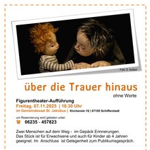 Am Freitag, 07.11.2025 um 18:30 Uhr erleben Sie im Gemeindesaal St. Jakobus, Kirchenstr. 16 in 67105 Schifferstadt auf Einladung des ► Ambulanten Hospiz-und Palliativ-Beratungsdienstes Südlicher Rhein-Pfalz-Kreis ein Figurentheater ganz besonderer Art.