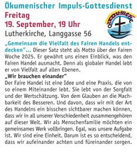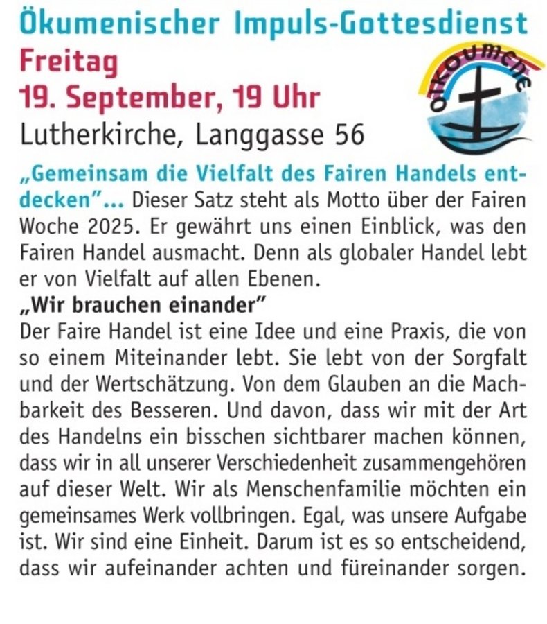 ... zum ökumenischen Impuls-Gottesdienst am Freitag, 19.09.2025, 19 Uhr, in der Lutherkirche (Langgasse 56).