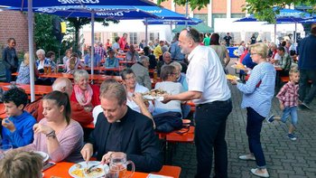 „Wir haben uns heute hier eingefunden zum Lob Gottes“, sagte Pfarrer Albrecht Effler zu Beginn des Ökumenischen Gottesdienstes am Samstagabend, mit dem die 37. Auflage des Gemeindefestes in Herz Jesu eröffnet wurde, das in diesem Jahr unter dem Motto „Glauben, leben, feiern“ stand. Es sei dabei zu einer guten Tradition geworden, Predigtgedanken des Evangelischen Kollegen zu hören. Das mache deutlich, in welchem Geist und welchem Sinn Gemeinde gefeiert werden soll, nämlich dass man nicht nur so als Menschen zusammenkommen sollten, sondern als Christen, die von Gottes Geist geprägt seien, um Gemeinschaft zu feiern.