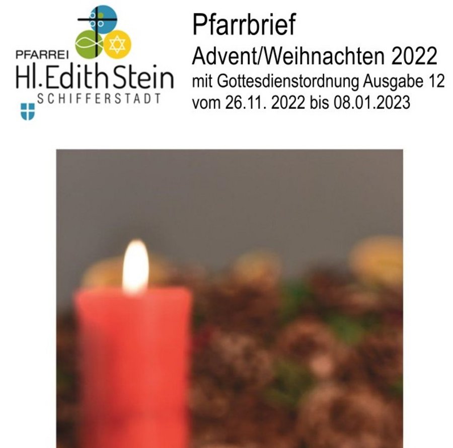 Der Pfarrbrief Weihnachten 2022 ist in diesen Tagen erschienen und von Ehrenamtlichen an alle katholischen Haushalte der Pfarrei Hl. Edith Stein in Schifferstadt in gedruckter Form verteilt worden. Einige Exemplare liegen darüber hinaus noch in den Kirchen der Pfarrei zur Mitnahme aus.