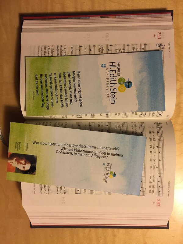 Außerdem wurde von der Grafik-Designerin ein schöner Buchzeiger gestaltet, der in den Kirchen zur Mitnahme ausliegt.