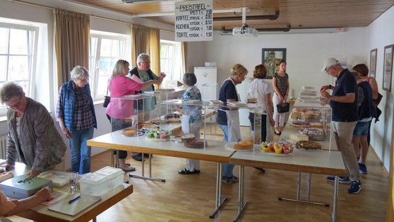 Anschließend hatte der Gemeindeausschuss im Hof und im Pfarrheim zum geselligen Beisammensein und Mittagessen eingeladen, was sehr gut angenommen wurde. Denn im Nu war es „rappelvoll“, da der Speiseplan viele kulinarische Köstlichkeiten zu bieten hatte. Der sonntags zusätzlich angebotene Rollbraten war nach der Mittagszeit dann auch ausverkauft. Ein reichhaltig bestücktes Kuchenbuffet, angeboten vom AK „Frauen“ und „Senioren“, erfreute die Herzen der Freunde des süßen Naschwerks und war am frühen Nachmittag ebenfalls ausverkauft.
