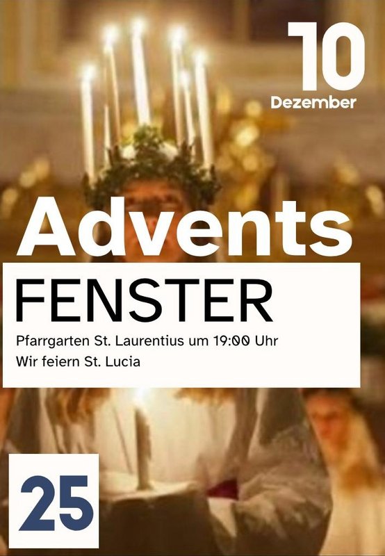 Am Mittwoch, 10. Dezember 2025 um 19:00 Uhr gestaltet der Gemeindeausschuss St. Laurentius im Pfarrgarten St. Laurentius (Jägerstr. 14) das Adventsfenster.