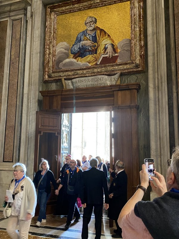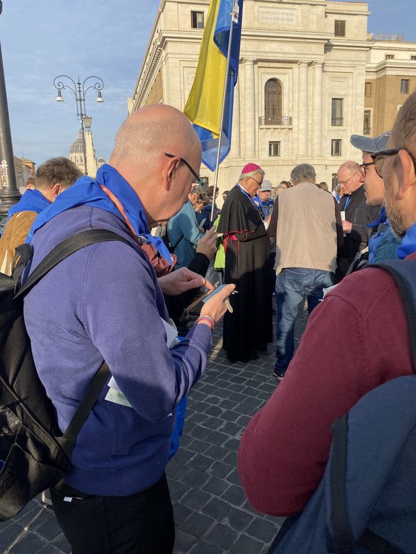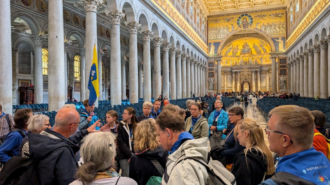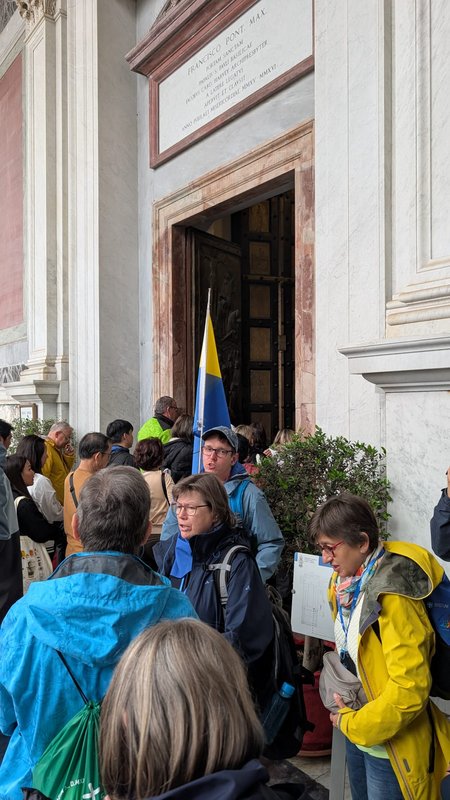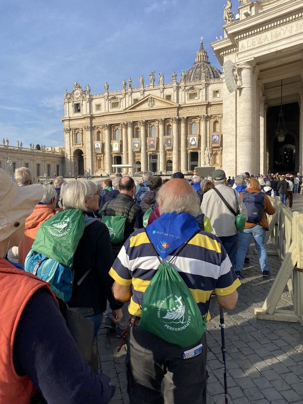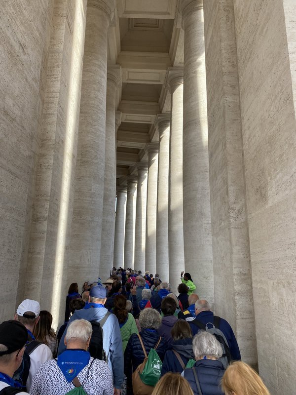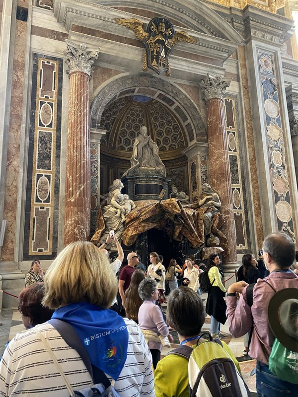Wieder ist ein Tag unserer Wallfahrt vorbei, und schon haben wir Halbzeit. Heute ging es ins Zentrum der Weltkirche, in den Vatikan. Gemeinsam mit den anderen Speyerer Wallfahrerinnen und Wallfahrern versammelten wir uns am Morgen unterhalb der Engelsburg, um einen Pilgerweg über die Via della Conziliazone zum Petersdom zu gehen. Auf diesem Weg gab es Psalmverse und Gedanken zum Motto "Pilger der Hoffnung". Mehrmals sangen wir "Meine Hoffnung und meine Freude". Wir zogen durch die Hl. Pforte, die Papst Franziskus an Weihnachten 2024 geöffnet hatte, durch den Dom zur Confessio über dem Petrusgrab, wo wir unseren Glauben bekannten. Auch dieser Weg war wieder eine besondere Erfahrung im Heiligen Jahr!