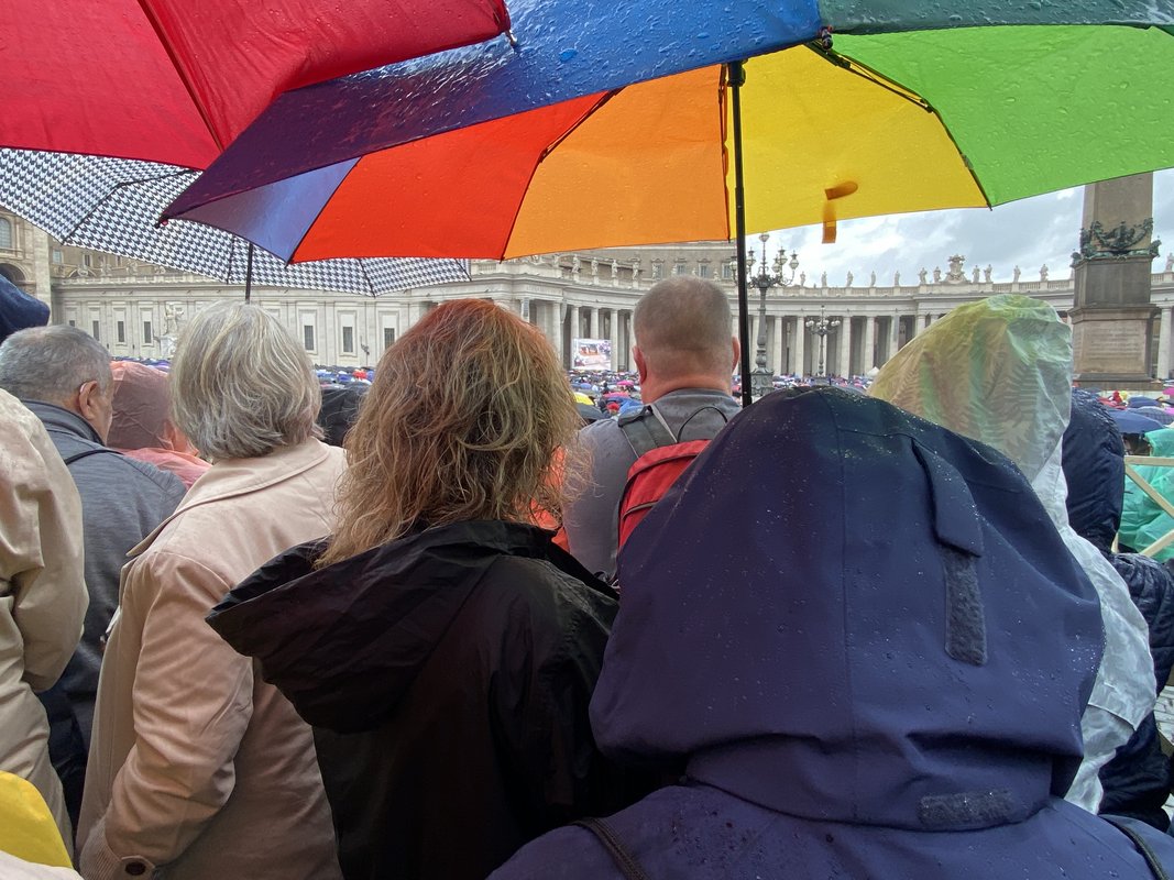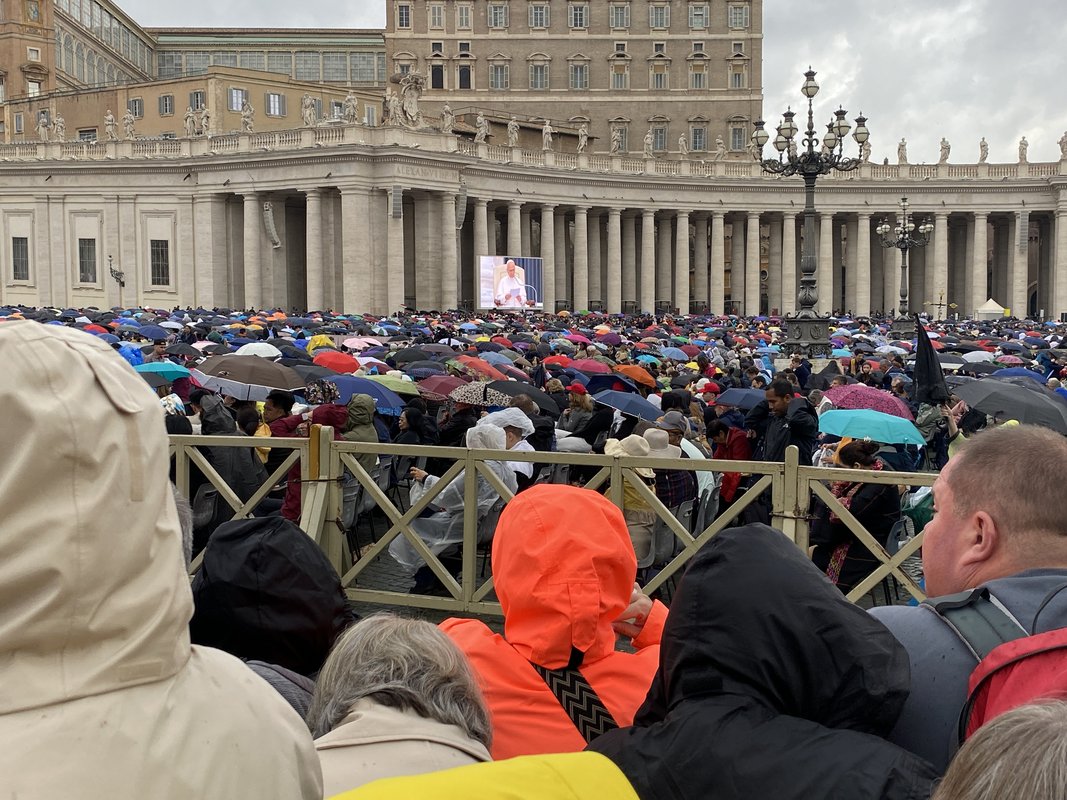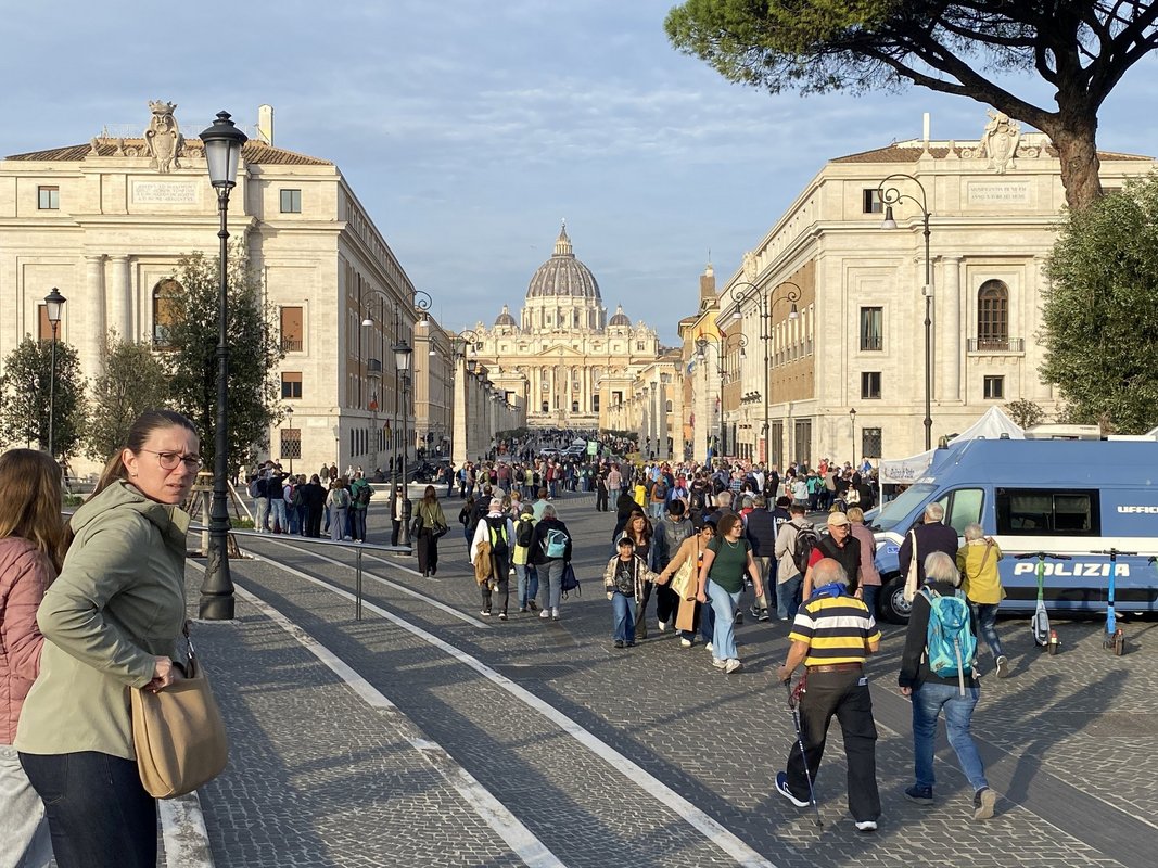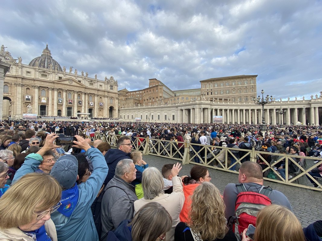 Nachdem wir die Sicherheitskontrollen passiert hatten, mussten wir feststellen, dass es keine freien Sitzplätze mehr gab – kein Wunder bei geschätzten 60.000 bis 80.000 Personen auf dem Petersplatz. Also suchten wir uns gute Stehplätze in der Nähe einer Absperrung, von der wir hofften, dass das Papamobil daran vorbeikommen würde.