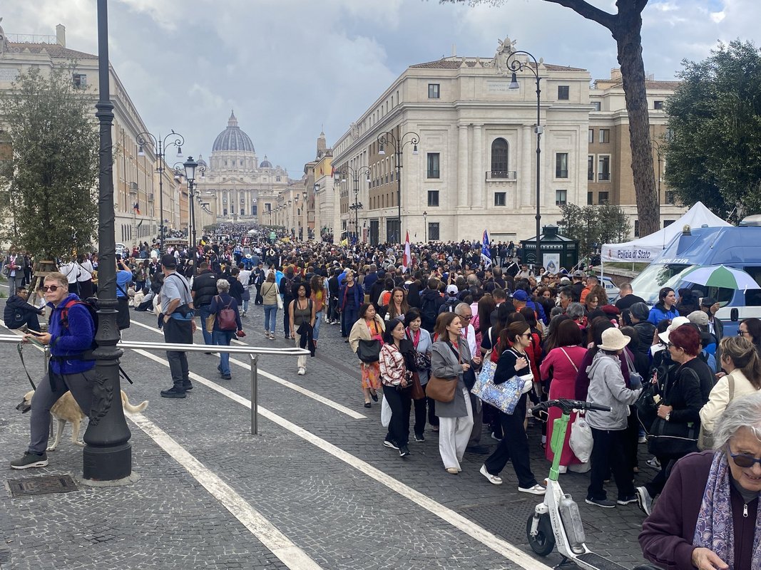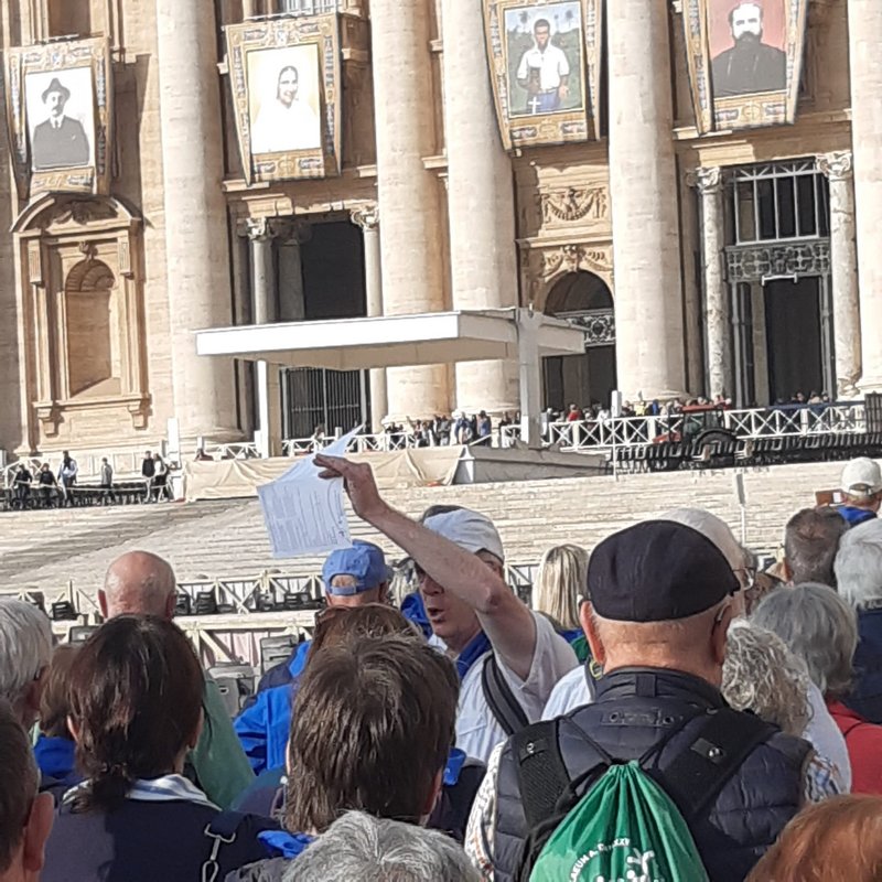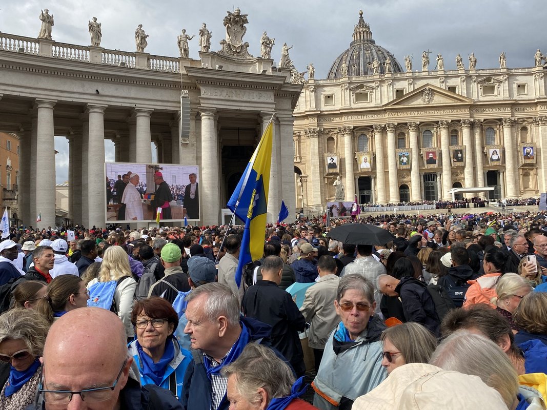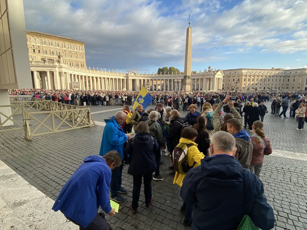 Nachdem wir die Sicherheitskontrollen passiert hatten, mussten wir feststellen, dass es keine freien Sitzplätze mehr gab – kein Wunder bei geschätzten 60.000 bis 80.000 Personen auf dem Petersplatz. Also suchten wir uns gute Stehplätze in der Nähe einer Absperrung, von der wir hofften, dass das Papamobil daran vorbeikommen würde.