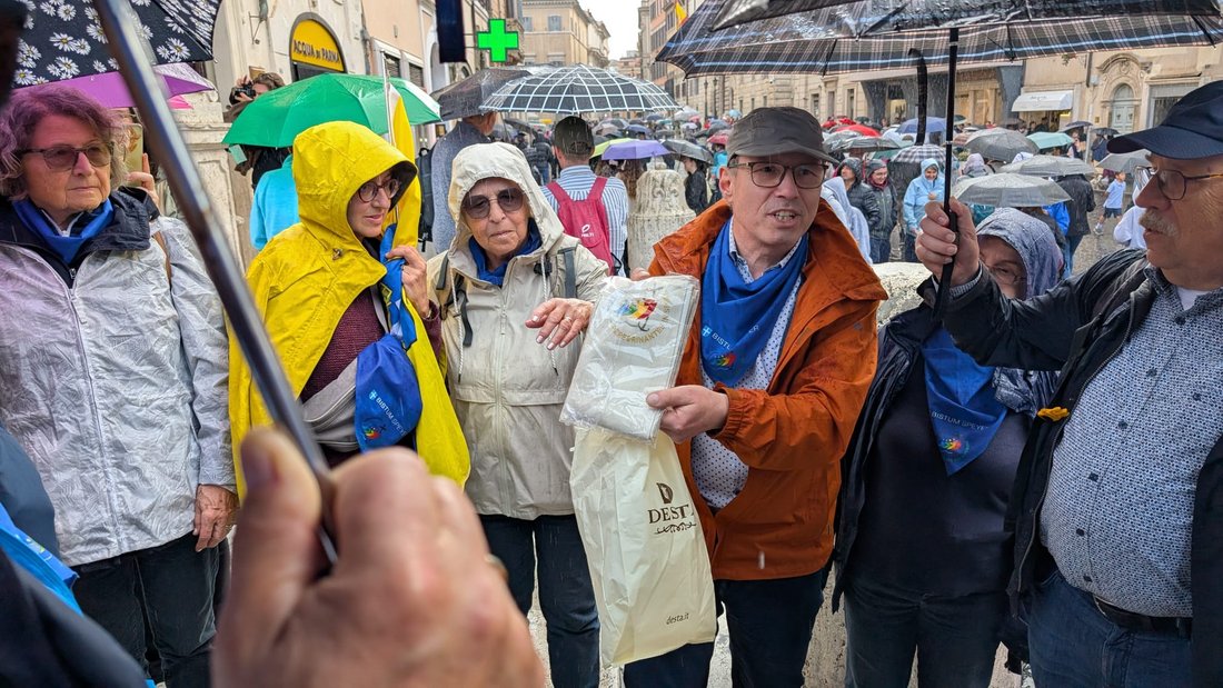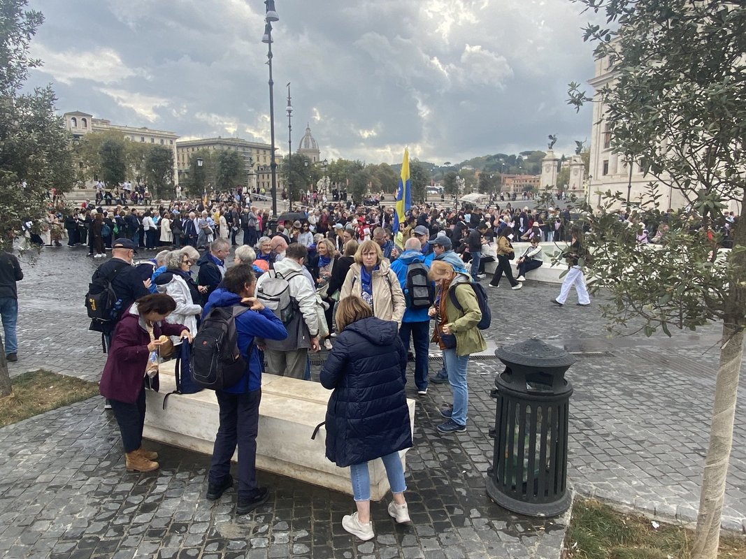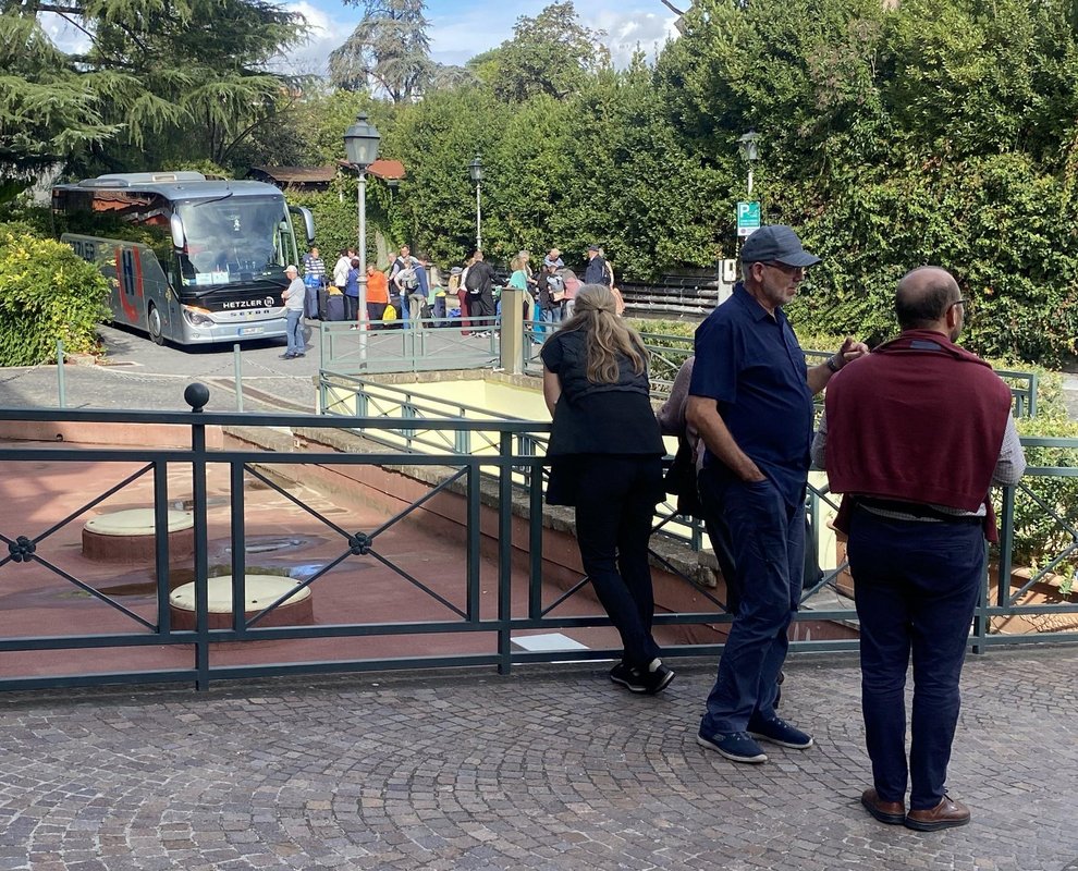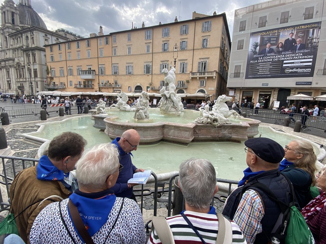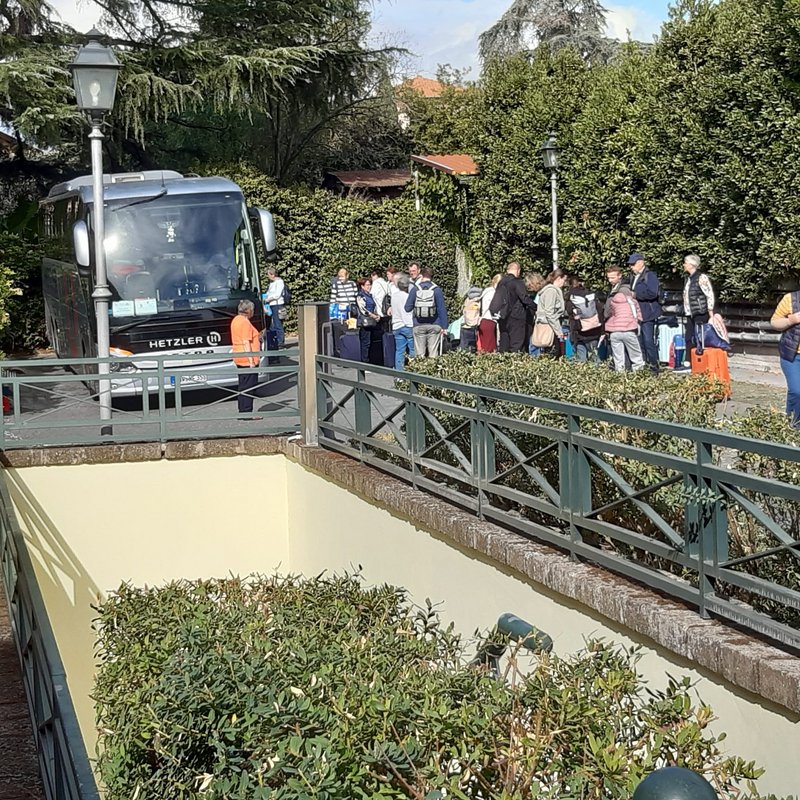 Die Fahrt führte uns entlang der Bergmassive der Dolomiten und dann durch zusehend mediterraner anmutende Landschaften. Wir kamen an so illustren Städten wie Verona, Mailand, Florenz, Pisa, Siena, Orvieto oder Assisi vorbei, die alle einen Besuch wert gewesen wären. Aber wir hatten ja ein anderes Ziel. Unterwegs auf den Rastplätzen kam es zu ersten Begegnungen mit den anderen Pilgergruppen aus dem Bistum Speyer und zu überraschenden Wiedersehen. So traf ein Mitfahrer aus unserem Bus eine Arbeitskollegin – beide hatten nicht voneinander gewusst, dass sie dabei sind.