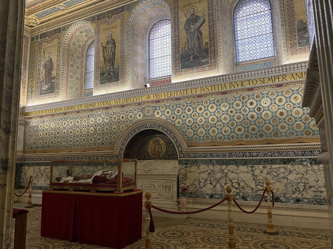 Im Innern der Kirche gab uns die Stadtführerin Anna mit großem Sachverstand viele Informationen über die Kirche, ihre Ausstattung und die Theologie, die dahintersteht. Sie erklärte die Mosaiken und viele der Statuen und Altäre. In dieser Kirche werden auch bedeutende Reliquien, besonders die Häupter der Apostel Petrus und Paulus, verehrt. Sie betonte dabei, dass es weniger darauf ankommt, ob diese historisch echt sind. Wichtiger ist, dass sie für uns Aussagen des Glaubens machen.