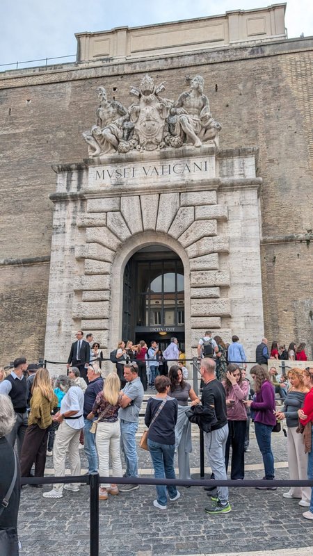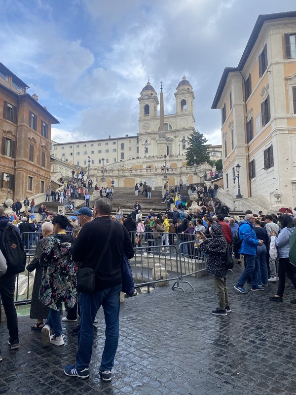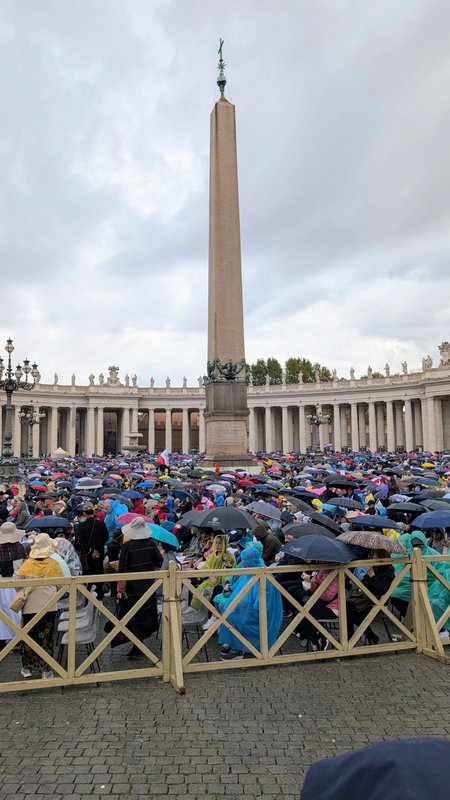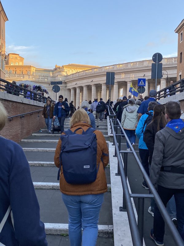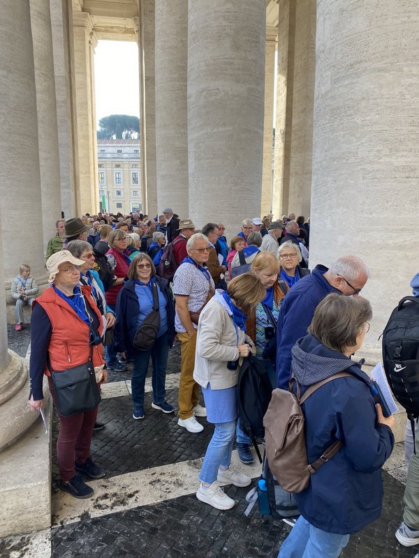 An unserem letzten Tag in Rom gab es noch einmal einen großen Höhepunkt, der für viele sehr bewegend war: die Teilnahme an der Papstaudienz mit Leo XIV. Dafür sind wir wieder sehr früh aufgestanden und nach einem schnellen Frühstück in die Stadt gefahren. Dort war schon ziemlich viel los. Vor den Kolonnaden des Petersplatzes bildete sich eine lange Schlange, in die wir uns geduldig einreihten. Menschen aus aller Herren Länder schienen gekommen zu sein, wie sich später auch bei der Nennung der Gruppen bestätigte.
