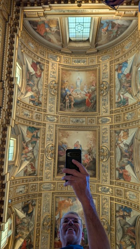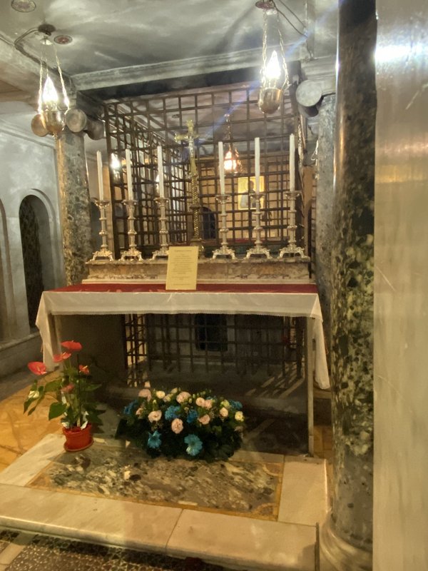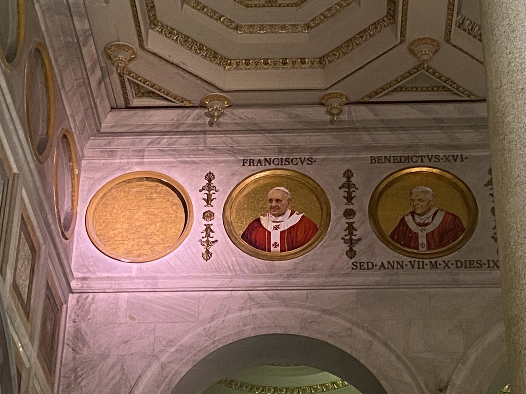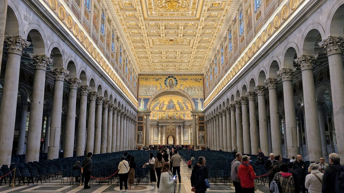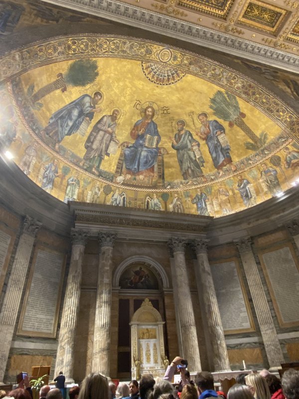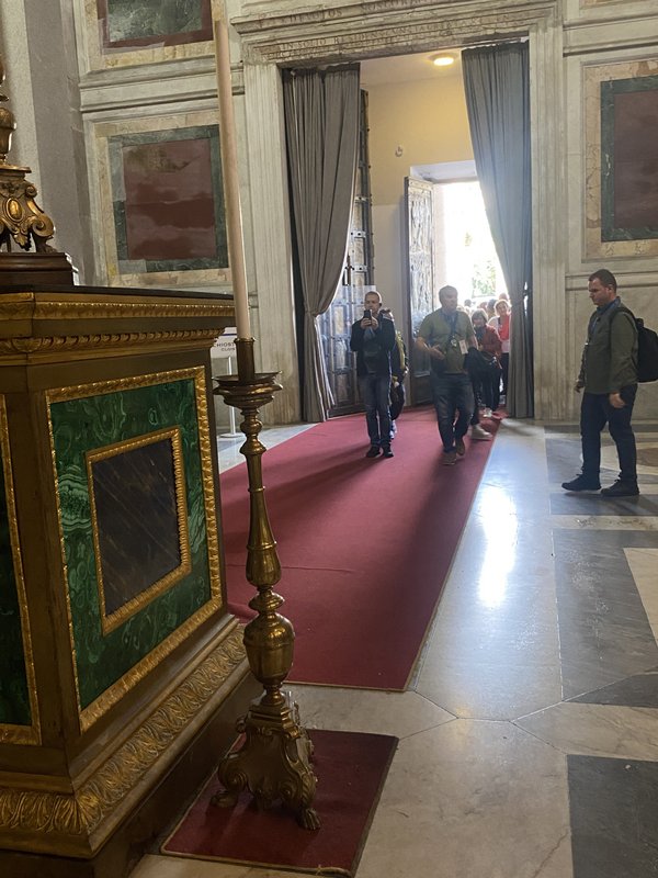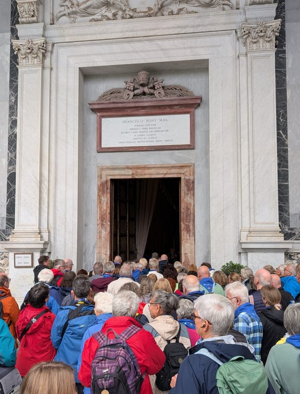 Nach einem Fußweg und der Mittagspause, die von einigen zur ersten Kontaktaufnahme mit dem römischen "Street-Food" oder auch Gelati genutzt wurde, ging es dann weiter in der Kirche Santa Maria Maggiore. Sie wurde zum Gedenken an das Konzil von Ephesus im Jahr 431, das die Gottesmutterschaft Marias festlegte, gebaut. Doch stand dort wohl schon ein Vorgängerbau im 4. Jahrhundert. Auch hier durchschritten wir die Heilige Pforte. Ein bewegender Moment war für viele der Besuch am Grab von Papst Franziskus in seiner römischen Lieblingskirche, in der auch die von ihm sehr verehrte Marienikone "Salus Populi Romani" zu sehen ist. Unter dem Papstaltar der Kirche Santa Maria Maggiore sollen sich Reste der Geburtskrippe Jesu befinden.