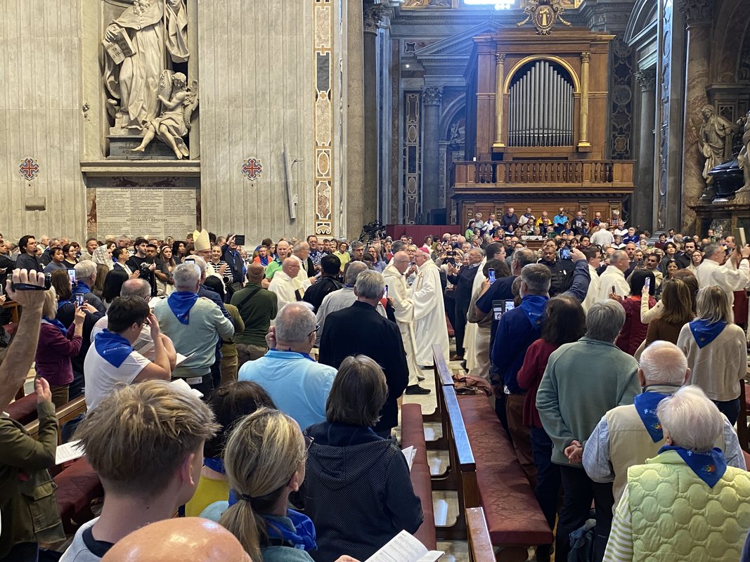 Bischof Dr. Wiesemann sprach in seiner Predigt von den vielen schönen Momenten auf dieser Wallfahrt, die jeder und jede persönlich erlebt hat. Er selbst hatte in diesen Tagen viele Erinnerungen an seine Studienzeit in Rom und seine Priesterweihe vor 40 Jahren. So sprach er auch von seiner ersten Begegnung mit Papst Johannes Paul II., dessen Gedenktag wir heute feierten. Er erinnerte sich, dass der Papst betont habe, dass das innere Hören wichtig sei. Auf dieses Hören, so Bischof Wiesemann, komme es an. Das Hören auf den Geist, der auch in der Wallfahrtsgemeinschaft sich in Vielfalt äußert, soll innere Kraft und Stärke auch im Alltag geben. So können wir für andere zu Pilgern der Hoffnung werden.