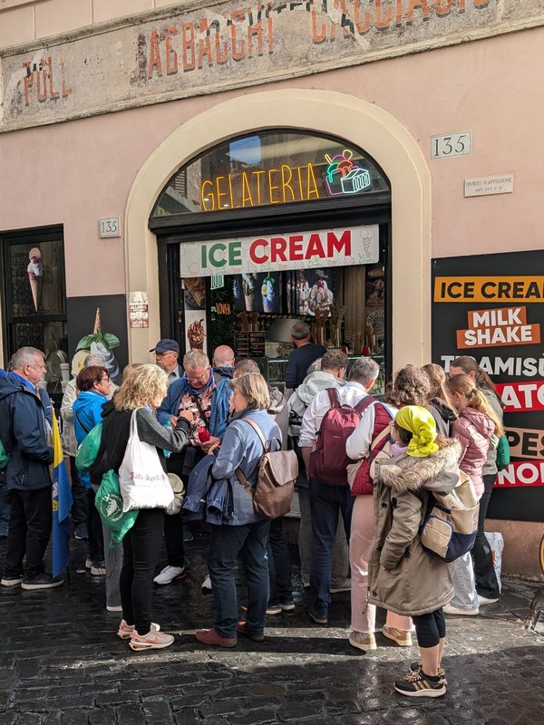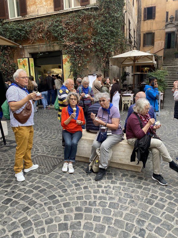 Ein anderer Teil ging auf Wallfahrt zu den "Eis-Heiligen". Damit waren aber ausnahmsweise nicht die vier Heiligen gemeint, an deren Gedenktage Mitte Mai es oft noch einmal kalt wird. Vielmehr führte der Weg zu drei der besten Eisdielen der Stadt. Im "Old Bridge", der "Gelateria del Teatro" und bei Giolitti konnte man nach Herzenslust schlecken. Wo das Eis am besten war, darüber gab es unterschiedliche Meinungen – über Geschmack lässt sich ja bekanntlich nicht streiten.