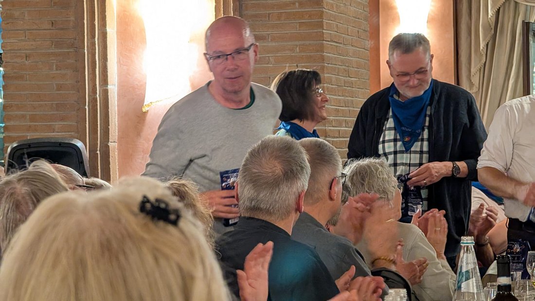 Anschließend bedankte sich Pfarreiratsvorsitzender Jürgen Reimer im Namen der ganzen Gruppe bei Pastoralreferent Heinrich Schmith und Pfarrer Stefan Mühl für die außerordentlich gelungene Pilgerreise, die perfekte Vorbereitung und Organisation, das umsichtige und bedachte Handeln, die ansprechenden geistlichen Impulse und Gebete, das ständig wohlwollende Kümmern um jedes einzelne Gruppenmitglied... Als Zeichen des Dankes überreichte er jedem eine Tasche mit italienischen Spezialitäten. Pfarrer Mühl erhielt zuvor schon eine Stola aus Rom, die das Logo des Heiligen Jahres zeigt.