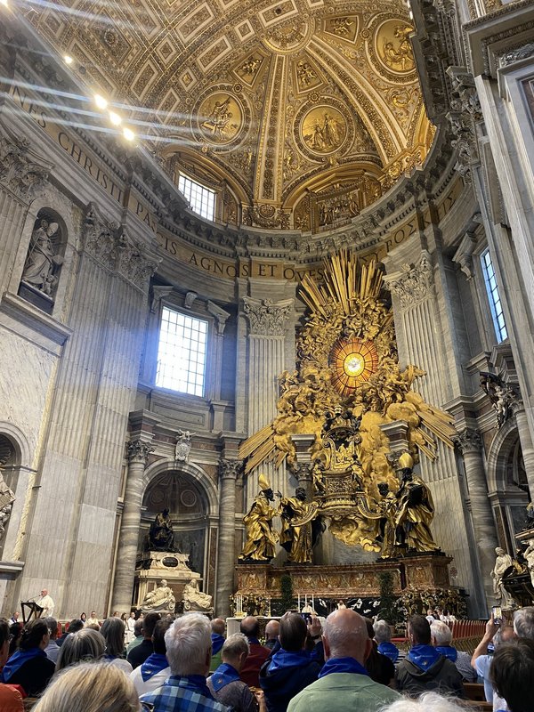 Anschließend feierten wir Eucharistie am Cathedra-Altar, unter dem berühmten Heilig-Geist-Fenster. Dort Gottesdienst zu feiern, ist ein großes Erlebnis. Ganz besonders freuten sich unsere drei Messdienerinnen, dass sie im Petersdom ministrieren durften. Die Predigt hielt Generalvikar Markus Magin. Er wies auf die "Cathedra Petri" hoch über dem Altar hin, einen Prunksessel aus Gold. Doch dahinter verbirgt sich ein einfacher Stuhl. Es ist wichtig, hinter die Fassade zu schauen, das Eigentliche zu entdecken. Das gilt auch für das Evangelium, in dem Petrus Jesus als den Messias, den Sohn Gottes bekannte. Er sah das Eigentliche, den Wesenskern Jesu. Diesen Blick auf Jesus Christus sollen wir entdecken, auch hier in Rom. Ihn gilt es zu finden, auch in den Krisen und Schwierigkeiten unserer Zeit und unserer Kirche. Mit Blick auf die anstehenden Strukturveränderungen im Bistum Speyer zitierte der Generalvikar abschließend Papst Franziskus: "Wer die Krise der Kirche betrachtet ohne den Blick auf Jesus Christus ist wie einer, der einen Leichnam seziert."