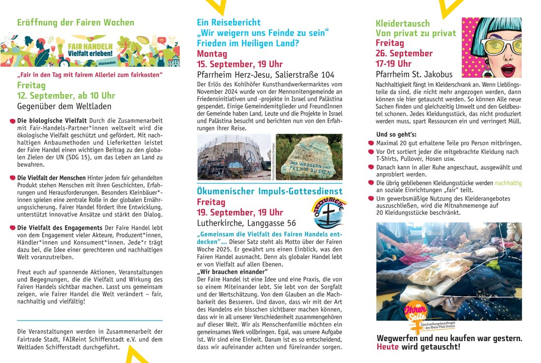 Freut euch auf spannende Aktionen, Veranstaltungen und Begegnungen, die die Vielfalt und Wirkung des Fairen Handels sichtbar machen. Lasst uns gemeinsam zeigen, wie Fairer Handel die Welt verändert – fair, nachhaltig und vielfältig!