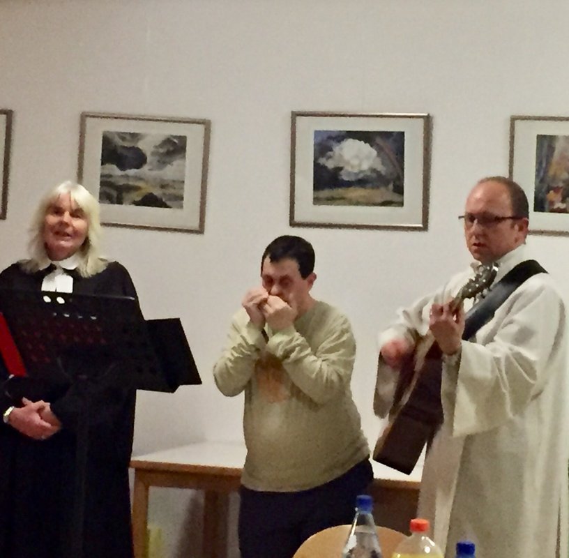 Musikalisch mitgestaltet wurde der ökumenische Gottesdienst von Pastoralreferent Heinrich Schmith an der Gitarre und Bewohner Stefan Wingerter an der Mundharmonika. Bei schönen Weihnachtsliedern wurde kräftig mitgesungen.