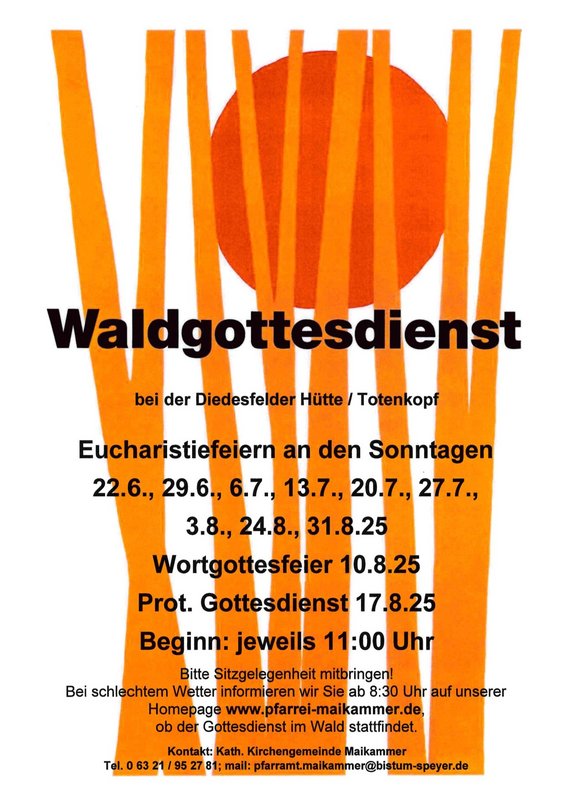 In unmittelbarer Nähe zur Totenkopfhütte des Pfälzerwald-Vereins Maikammer Alsterweiler e.V. gibt es eine Freifläche, auf der von Ende Juni bis in den August immer sonntags eine Pfarrei den Waldgottesdienst gestaltet - und am 31. August wird das wieder unsere Pfarrei sein. Mit dabei ist Pfr. Stefan Mühl und ein Organisationsteam aus unseren Gemeindeausschüssen und dem Pfarreirat.