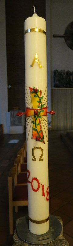 Die Osterkerze in der Gemeinde Herz Jesu wurde wie in den letzten Jahren wieder vom Messdienerleitungsteam übernommen. Das Motiv zeigt dieses Mal ein Kreuz, das in gelb, orange und rot, also in den Farben des Feuers, leuchtet, und damit auch den Fokus der Kerze darstellt. Außerdem ist darauf ein blühender Zweig zu sehen, der das Symbol des Todes, das Kreuz, überwächst und damit zum Zeichen des Lebens, zum Zeichen der Hoffnung wird. Umgeben ist es von den goldenen Strahlen der Auferstehung, die nicht nur das Kreuz erleuchten, sondern jedem einzelnen Menschen den Weg zum ewigen Leben bei Gott eröffnen. Eingerahmt ist es auch von Alpha und Omega, die das schöne Motiv damit abrunden. Am unteren Rand schmückt die Jahreszahl 2018 die Kerze, die aussagen will: Der Tod ist besiegt, das Leben durch den Tod Jesu Christi am Kreuz für immer gewonnen.