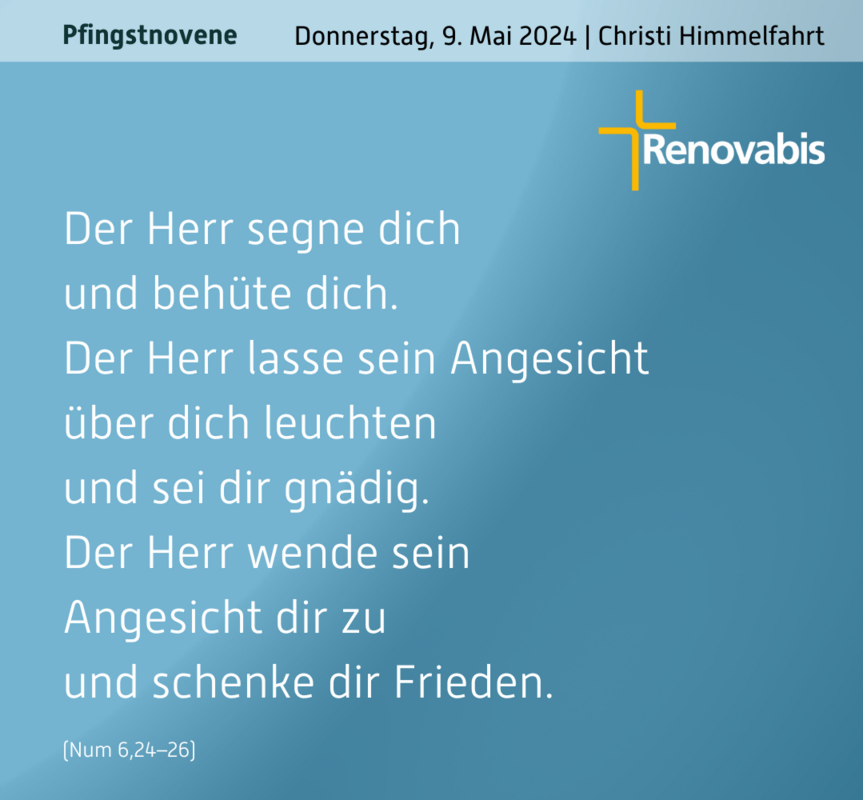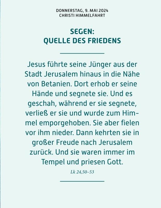 Jesu letzte Geste, bevor er von der Erde zum Himmel zurückkehrt, ist sein Segen. Noch einmal segnet er, mit erhobenen Händen, seine Jünger. Ob er dies mit Worten oder in stiller Zugewandtheit tut, bleibt offen. Doch sein Segen entfaltet Wirkung. Voller Freude kehren die Jünger nach Jerusalem zurück. Segnen im biblischen Sinn bedeutet, jemanden mit Kraft auszustatten, ihm oder ihr Gutes zuzusprechen. Im Segen liegt die Zusage des Schalom, des Friedens, des Wohlergehens und des Heils. Der bekannteste egenszuspruch findet sich im Buch Numeri: „Der Herr segne dich und behüte dich. Der Herr lasse sein Angesicht über dich leuchten und sei dir gnädig. Der Herr wende sein Angesicht dir zu und schenke dir Frieden.“ (Num 6,24–26)